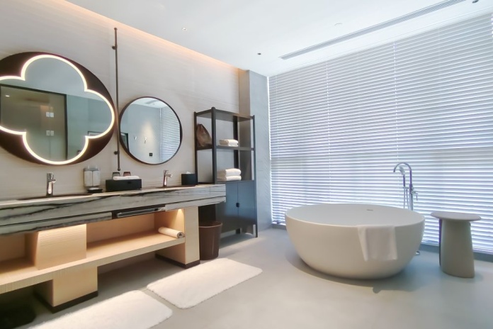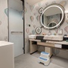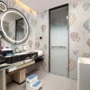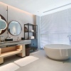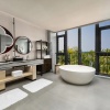 * В части номеров и сьютов ванная комната с раковиной, ванной, душевой кабиной и туалетом отделена от жилой зоны стеклянной матовой перегородкой.