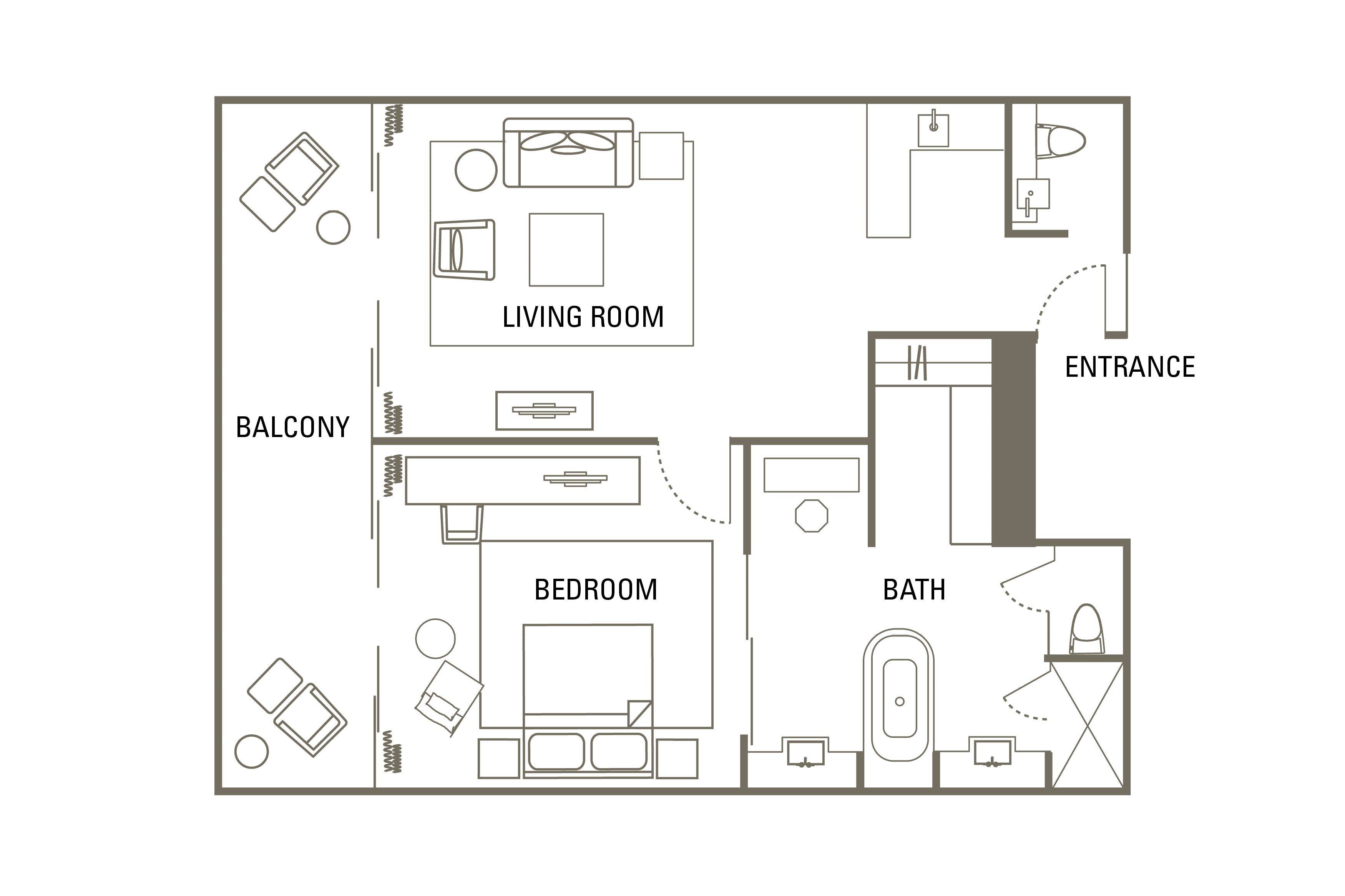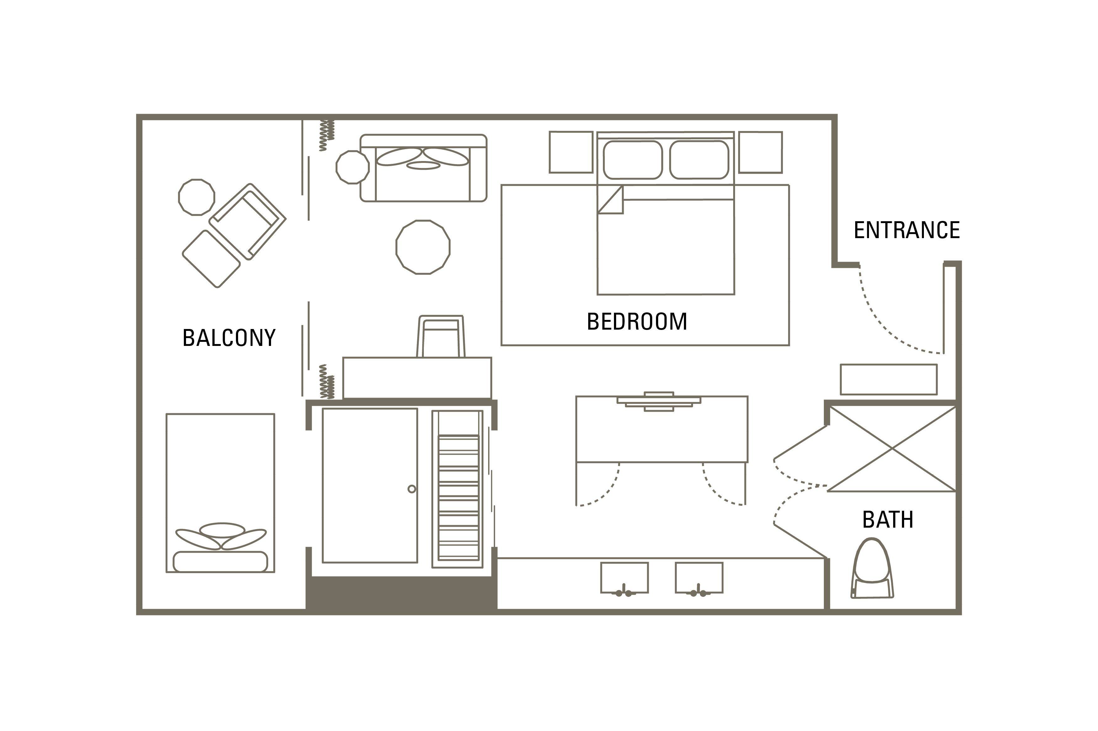 Двухкомнатный сьют на 2-3 этажах: спальня с двуспальной кроватью king size, ванная комната с ванной и душевой кабиной, гардеробная: отдельная гостиная с раскладным диваном, рабочий стол, гостевая ванная комната; выход из спальни и гостиной на меблированный балкон во всю длину номера (20 м²); вид на сад/океан; план номера;
