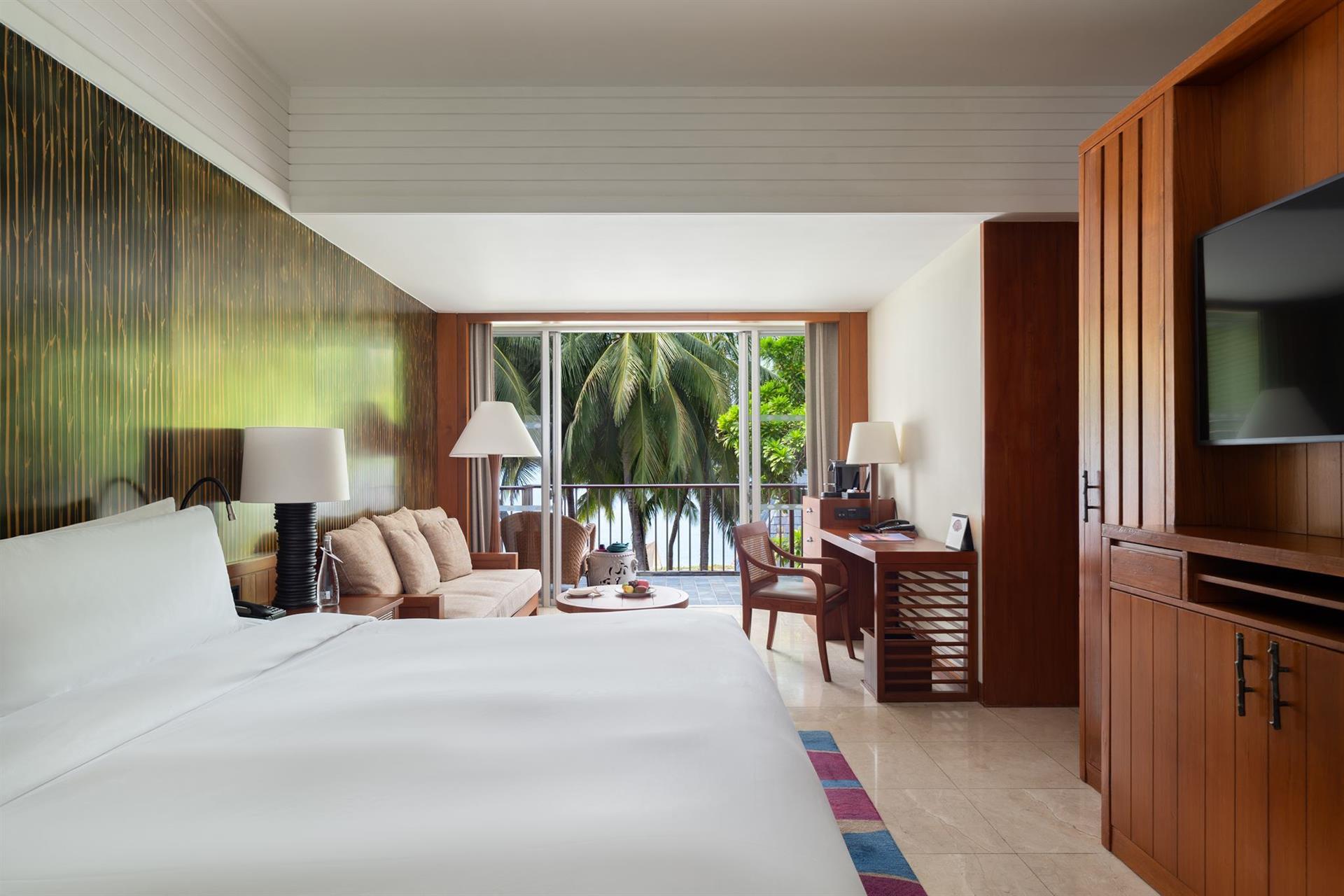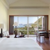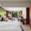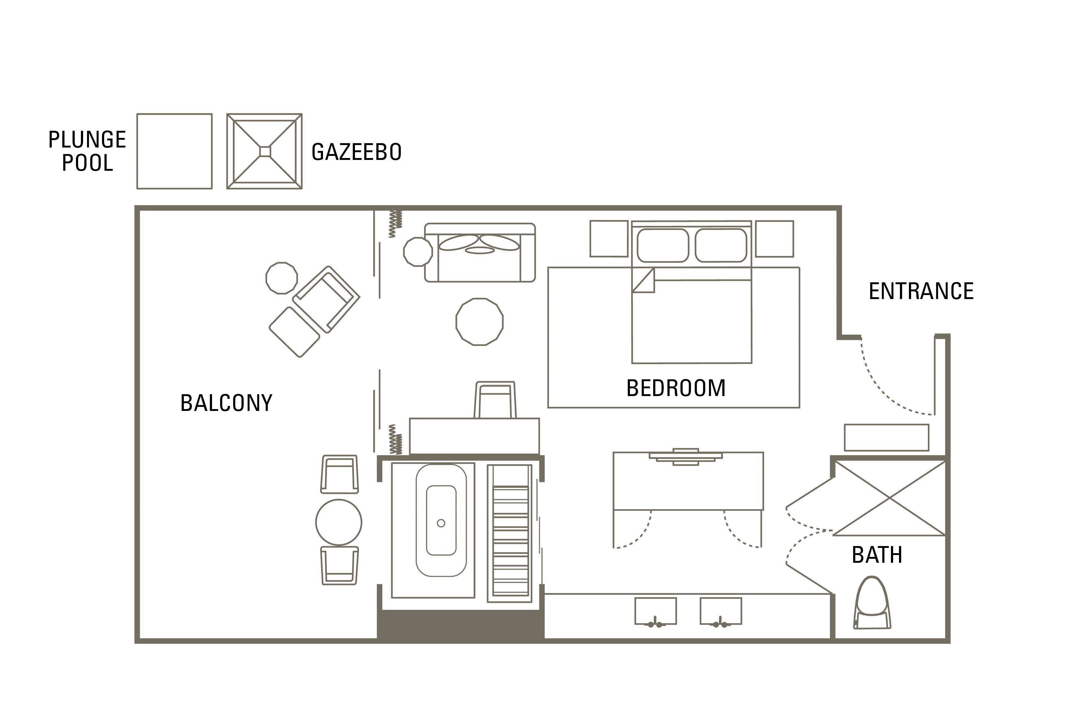 Номер-павильон на 1 этаже, в корпусах вдоль набережной: 1 двуспальная кровать king size, гостевая зона с диваном, ванная комната с душевой кабиной и ванной с оконным проемом на меблированную террасу-патио (25 м²), выход к общему для номеров Pool Pavilion King бассейну; вид на море/ сад/ бассейн; план номера;