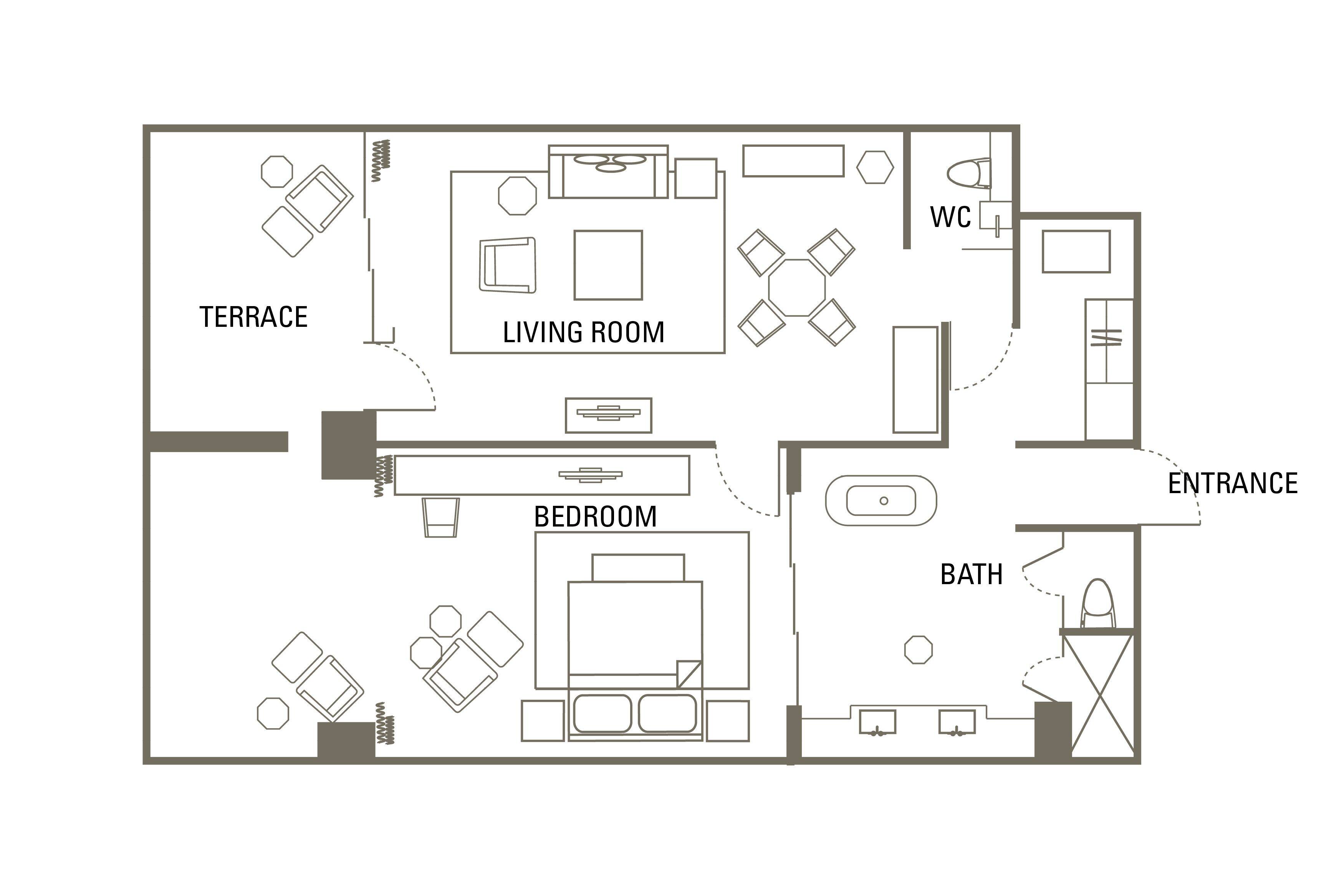 Двухкомнатный сьют на 1 этаже: спальня с двуспальной кроватью king size, ванная комната с ванной и душевой кабиной, гардеробная, гостевая ванная комната, гостиная с раскладным диваном и обеденной зоной на 4 персоны, меблированная терраса (32 м²); вид на сад; план номера;