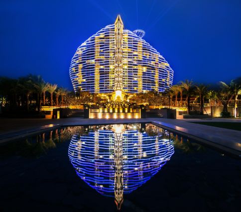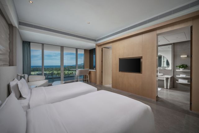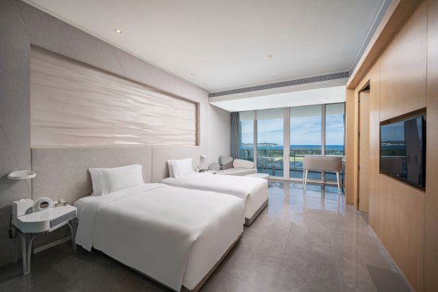 Mangrove Tree Resort Haitangbay состоит из одного 33-х этажного здания. Фойе отеля оформлено в стиле «храма света и тени» с авторским дизайном Милана Шипека: серый бетон, инсталляции, преломление света и эффектная стальная «радуга» на потолке создают атмосферу современного арт-пространства. Коридоры с «небесными садами» и световыми эффектами напоминают путешествие во времени. В отеле — 508 номеров, включая 18 двухуровневых люксов с панорамным видом на море (дизайн в стиле Star Alliance) и 29 вилл с садом и частным бассейном. Все номера предлагают 180° вид на море, стильный интерьер и максимальный комфорт. На 33-м этаже — вертолётная площадка с возможностью прямого прилёта. Круглосуточный батлер-сервис на виллах обеспечивает высокий уровень приватности и сервиса.