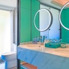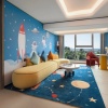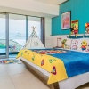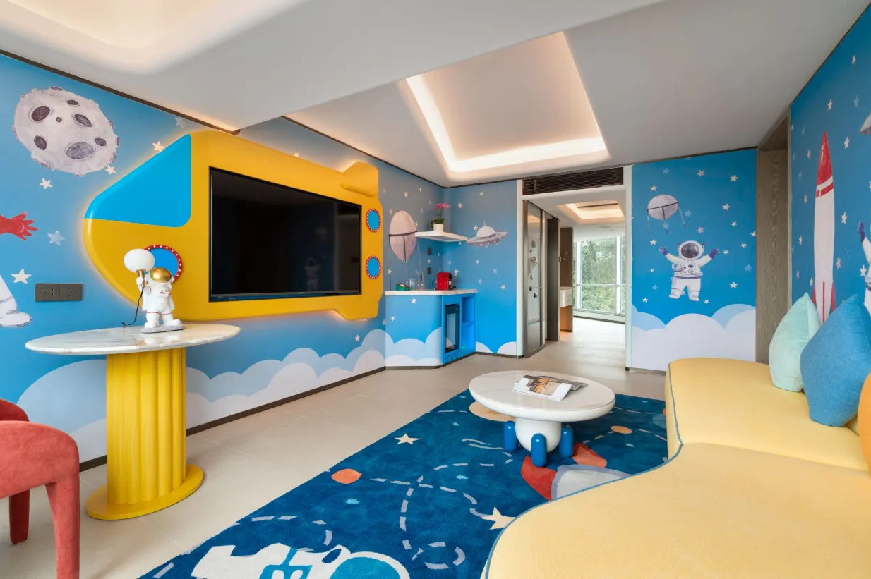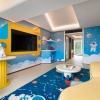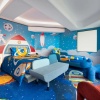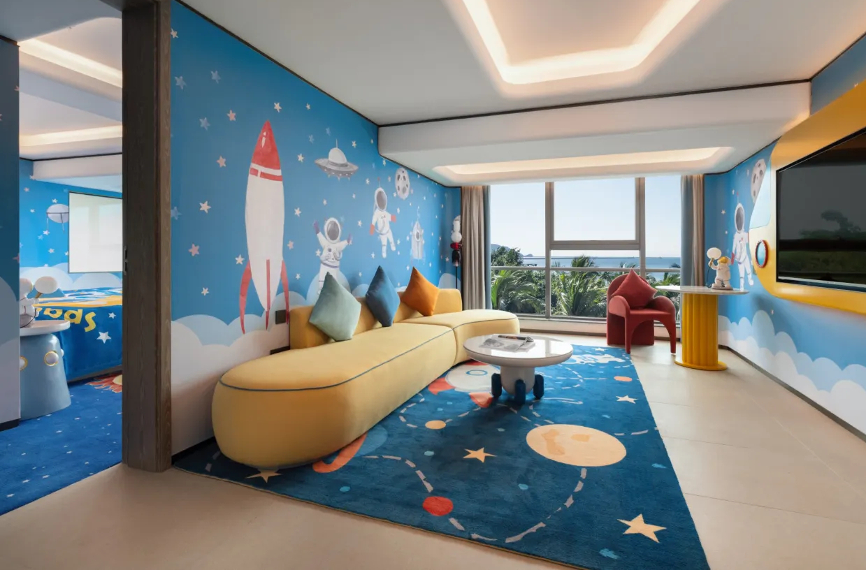 3 этаж, семейный люкс с детской «космической» тематикой: отдельная спальня с двуспальной кроватью (ширина 1,5 м) и односпальной кроватью (ширина 0,9 м), отдельная гостиная с диваном, отдельная ванная комната с душевой кабиной и двойной раковиной, без балкона, вид на море;