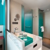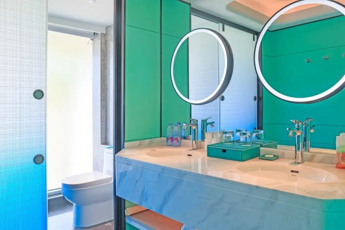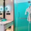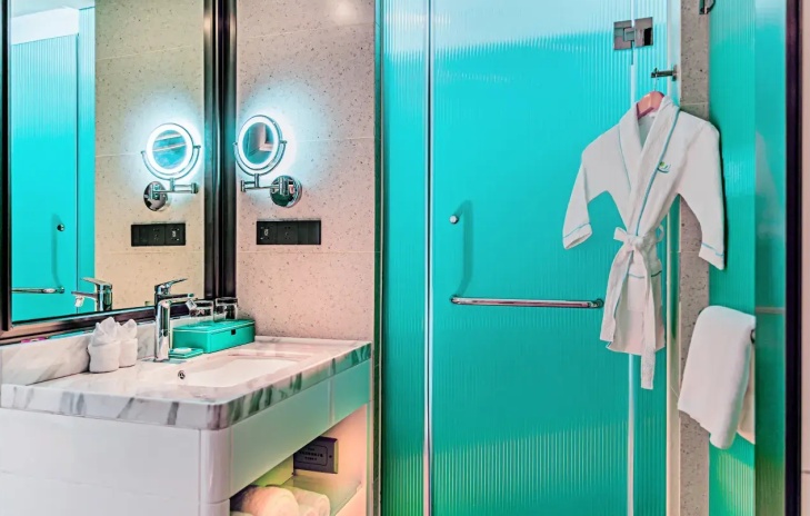 В номерах ванная комната отделена от жилой зоны сдвижными матовыми перегородками, в люксах - раздвижными дверьми.