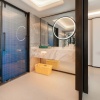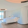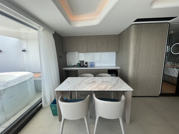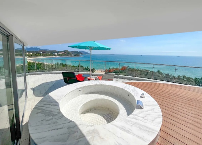 5 этаж, дизайнерский люкс открытой планировки с двуспальной кроватью (ширина 1,8 м, гостевой и обеденной зонами, отдельная ванная комната с душевой кабиной и ванной, балкон-терраса с ванной на свежем воздухе, шезлонгами и зонтом, вид на море;
