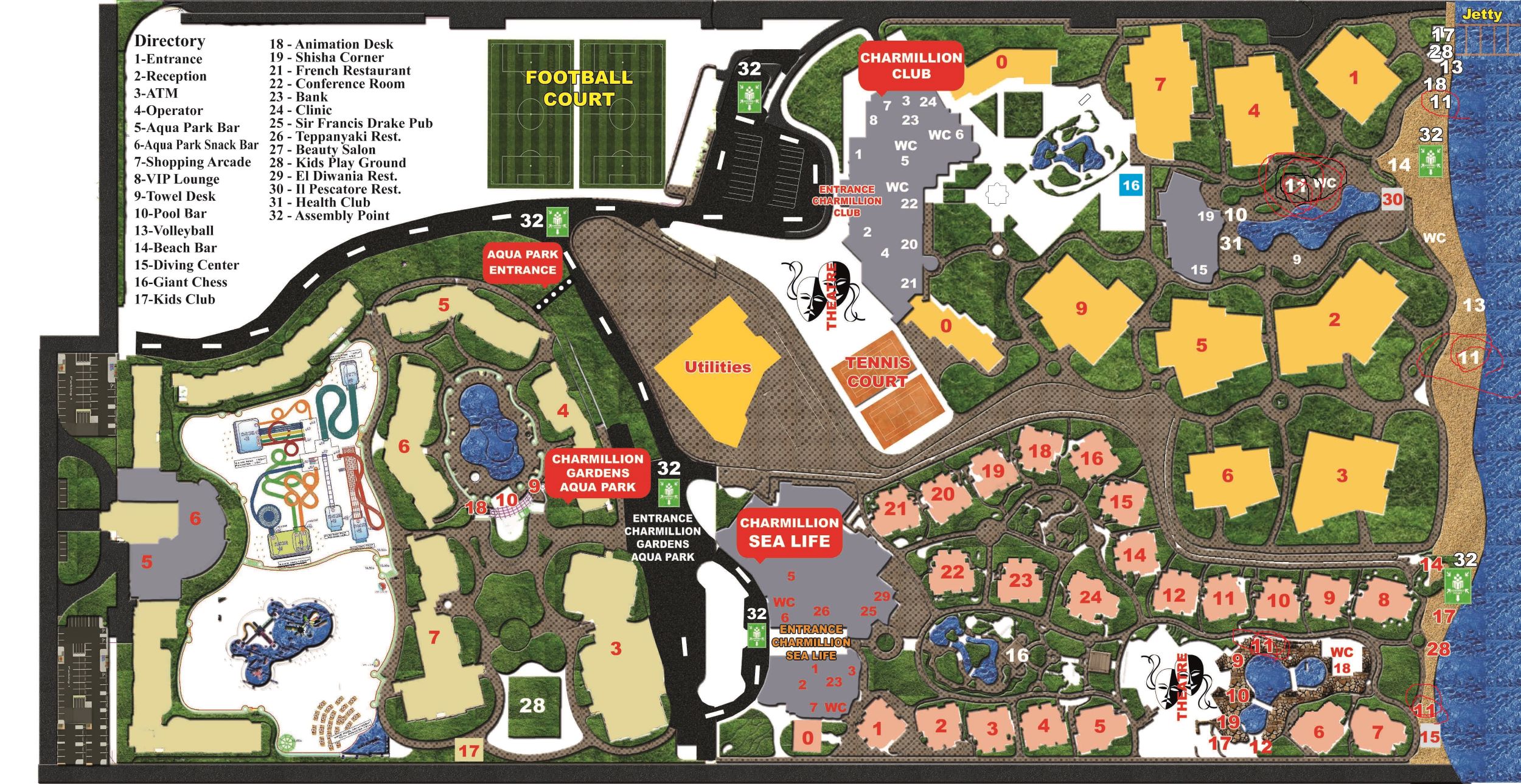 Charmillion Club Resort входит в общий гостиничный комплекс с отелями Charmillion Sea Life Resort и Charmillion Gardens Aqua Park, гости могут пользоваться всей инфраструктурой. Посещение аквапарка в Charmillion Gardens — за дополнительную плату.