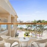 Спальня с двуспальной кроватью, гостиная комната с диваном, ванная комната с душем, балкон/терраса, вид на бассейн.