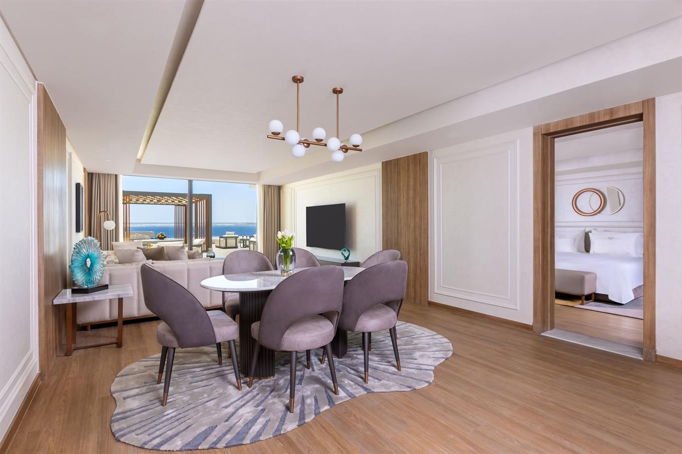 Президентский люкс на 1-й линии с 2-мя комнатами: спальня с двуспальной кроватью и зоной отдыха, просторная гостиная с раздельными зонами отдыха и обеденной зоной, гардеробная, ванная комната с двойной раковиной и ванной, большая меблированная терраса/ балкон, вид на пляж/ на море;
