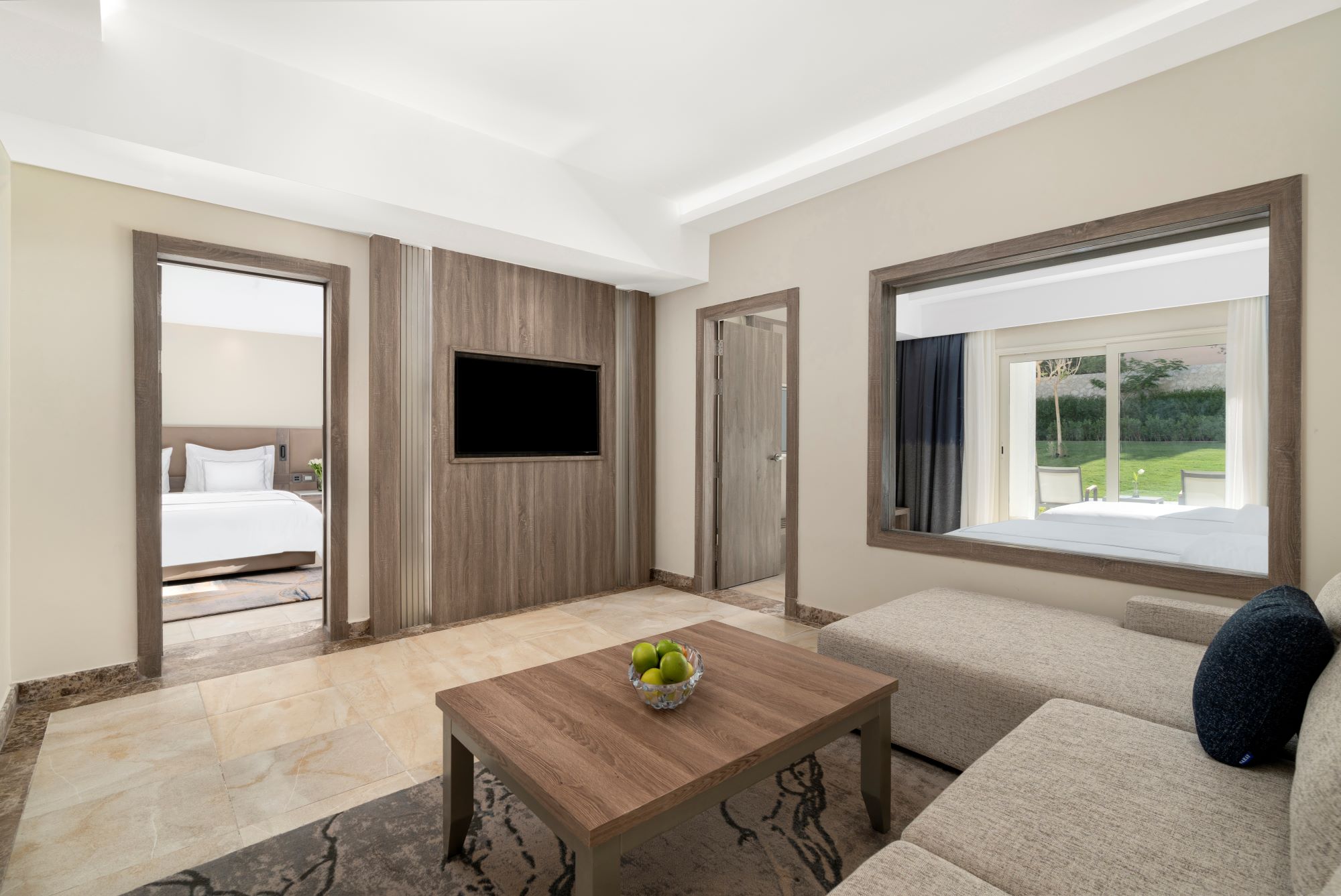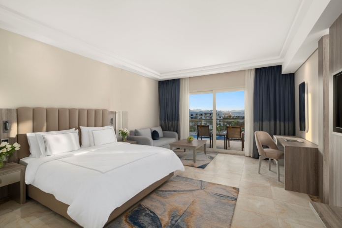 Полулюкс с 2-мя комнатами: спальня с двуспальной кроватью, отделенная дверью гостиная с диваном и обеденной зоной, ванная комната с душевой кабиной, меблированный балкон/ терраса, вид на бассейн/ на сад;