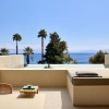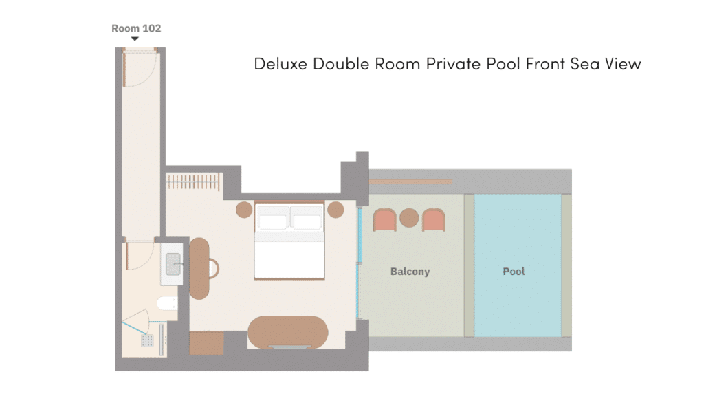 Двуспальная кровать king-size, диван-кровать или пуф, ванная комната с душем, меблированный балкон (шезлонг, кофейный столик), персональный небольшой бассейн, прямой вид на море, план номера, фото номера;