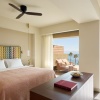 Двуспальная кровать king-size, гардеробная, диван-кровать, ванная комната с душем, меблированный балкон и панорамные окна (шезлонг у бассейна, кофейный столик), вид на море, план номера, фото номера;