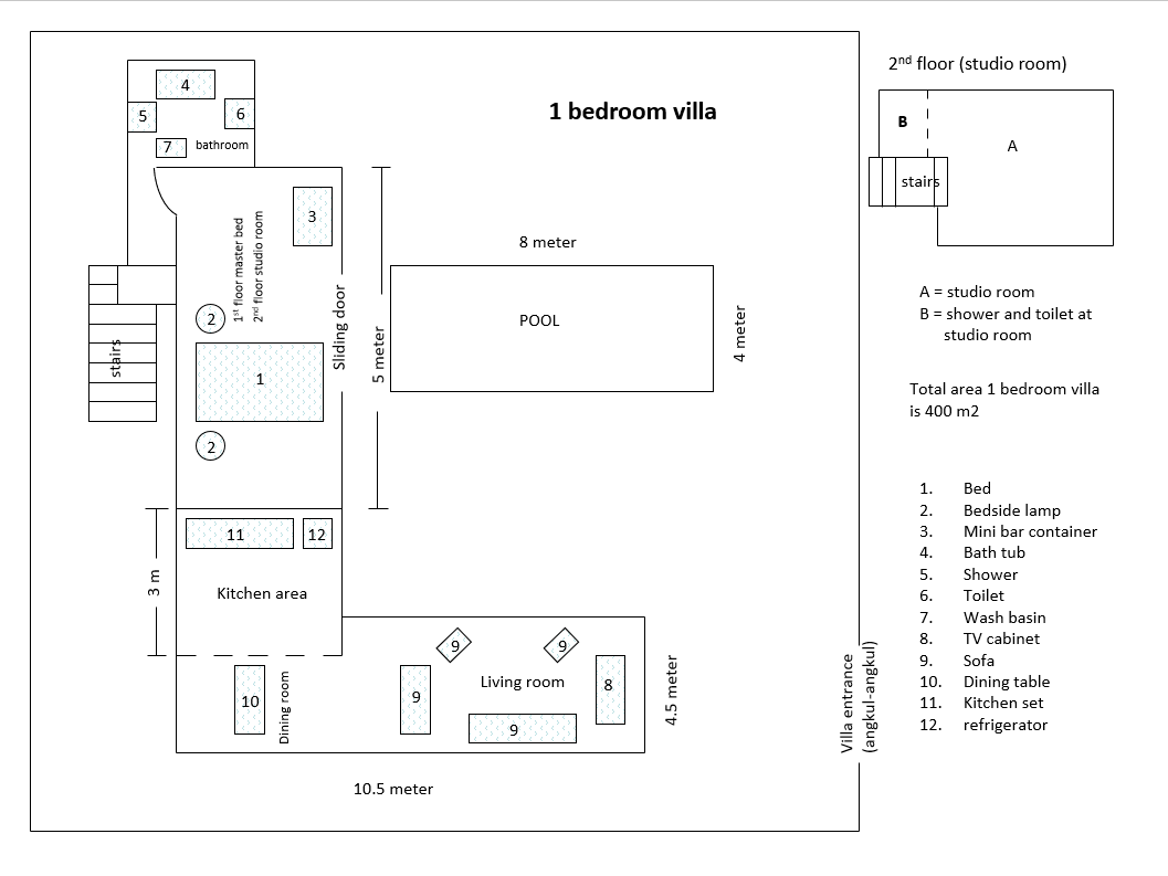 В виллах: кондиционер, сейф, мини-бар (ежедневное пополнение),телефон, фен, халаты и тапочки, бесплатный Wi-Fi, спутниковое телевидение, принадлежности для приготовления чая и кофе, круглосуточные услуги дворецкого.