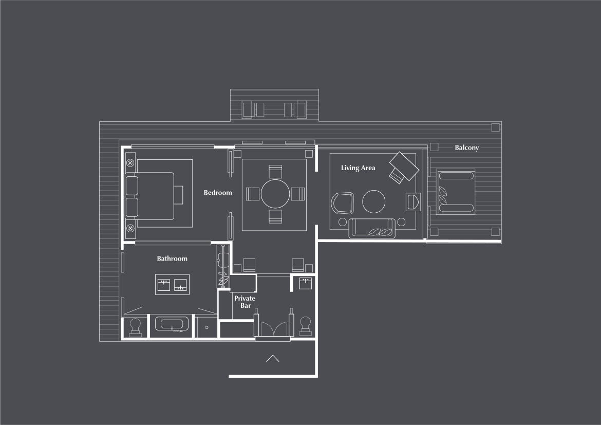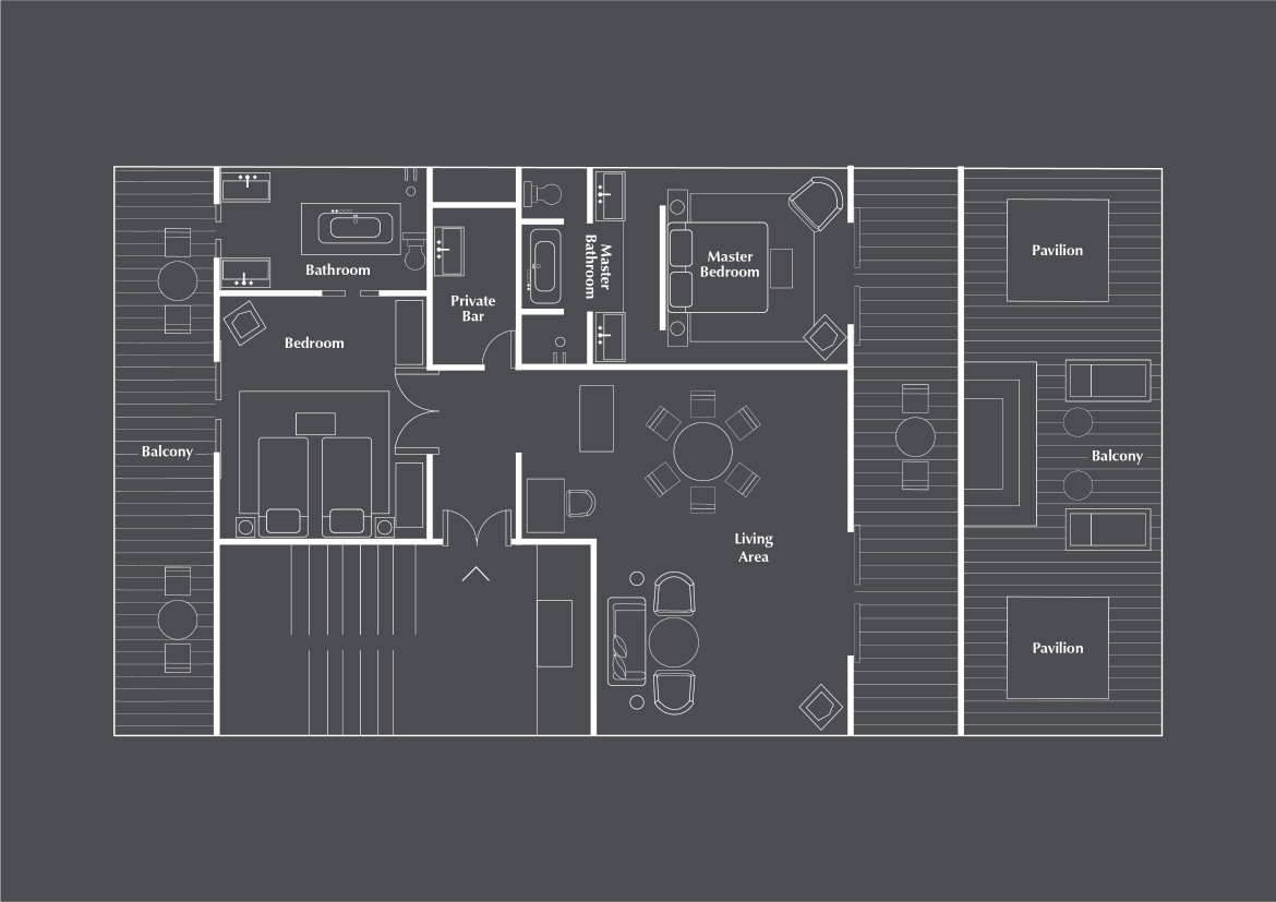 Расположен на втором этаже, 2 спальни: двуспальная кровать king-size и 2 односпальные кровати, 2 ванные комнаты с ванной, отдельная гостиная комната с диваном и обеденным столом, балкон, вид на океан, преимущества The Club by The Legian Seminyak, см. план номера;