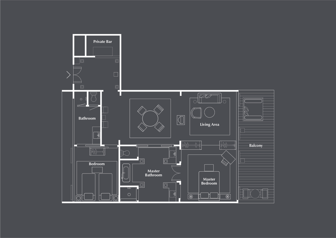 Расположен на третьем этаже, 2 спальни: двуспальная кровать king-size и 2 односпальные кровати, 2 ванные комнаты с ванной, отдельная гостиная комната с диваном и обеденным столом, балкон, вид на океан, преимущества The Club by The Legian Seminyak, см. план номера;