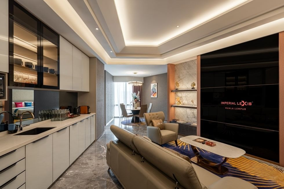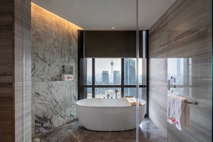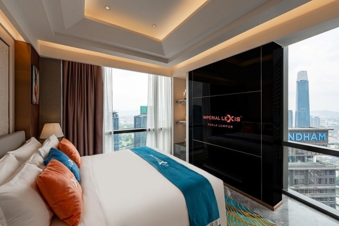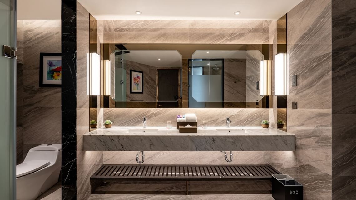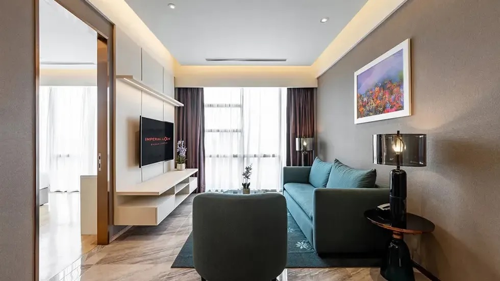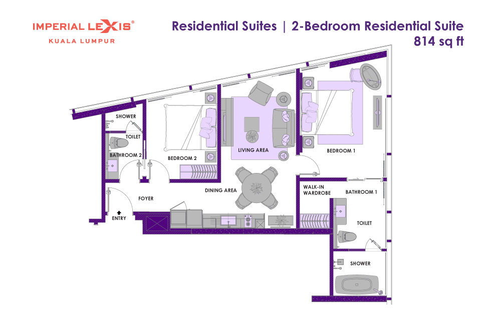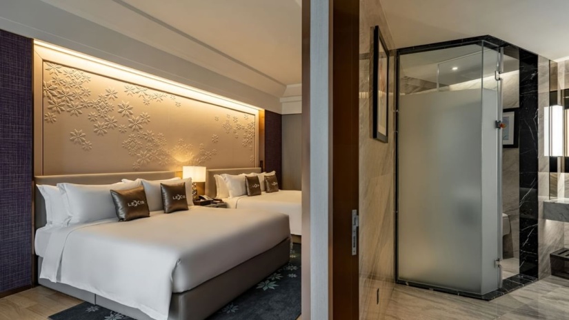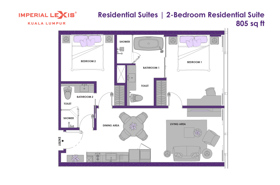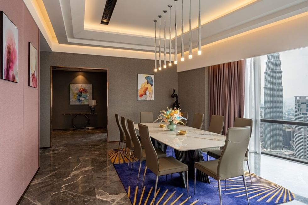 Сьют–апартаменты с 2-мя спальнями на 36-45 этажах: каждая с двуспальной кроватью и собственной ванной комнатой с душем (ванная комната главной спальни с душем и ванной), отдельная гостиная, обеденная зона со столом на 4 персоны и мини-кухня: холодильник, СВЧ-печь, плита, раковина, шкафы для хранения, стиральная и сушильная машины, вид на башни-близнецы; план номера вар.1, план номера вар.2, план номера вар.3;
