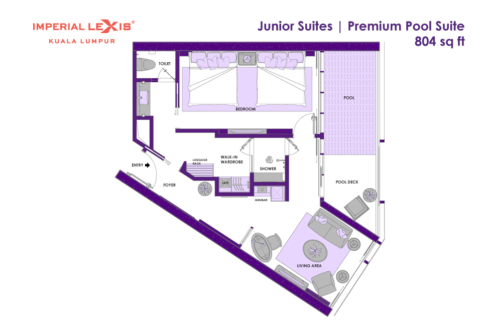 Представительский номер с 1-ой двуспальной кроватью, ванная комната с душевой кабиной, гардеробная, гостевая зона, балкон с частным бассейном (без подогрева), вид на город, вид на башни-близнецы, план номера вар.1, план номера вар.2, план номера вар.3, план номера вар.4;