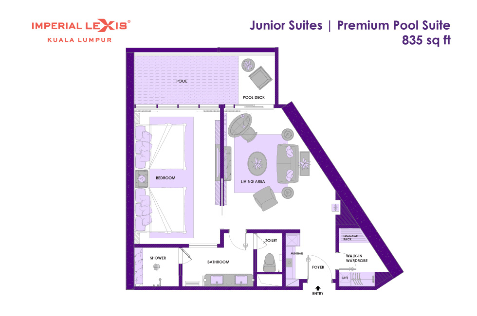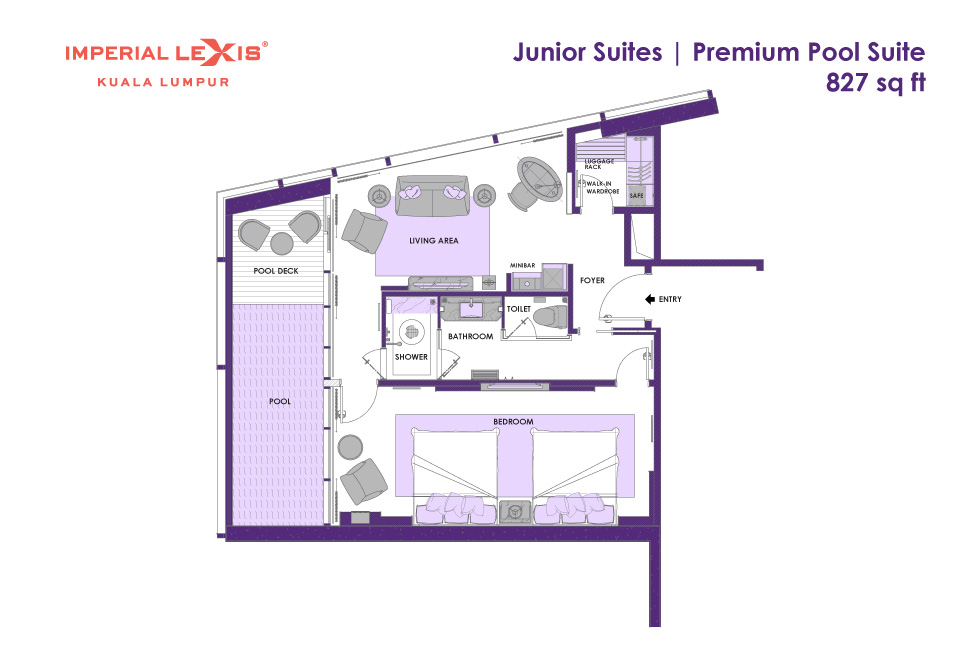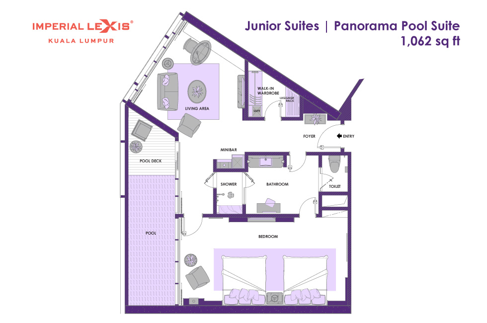 Двухкомнатный панорамный сьют: спальня с 2-мя двуспальными кроватями, ванная комната с душевой кабиной, гардеробная, отдельная гостиная, балкон с частным бассейном (без подогрева), панорамный вид на город, план номера вар.1, план номера вар.2, план номера вар.3;