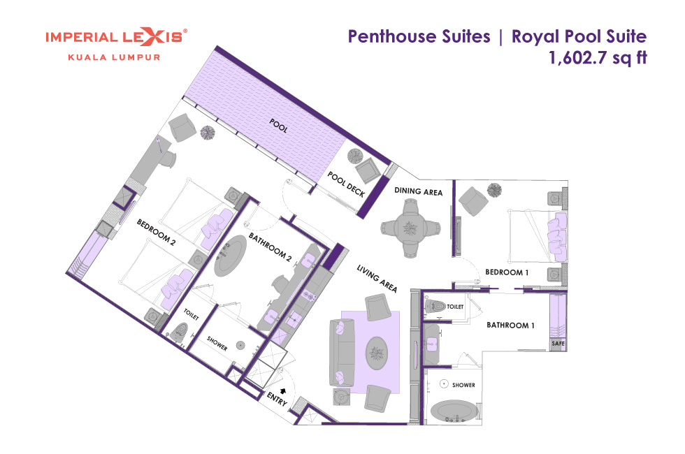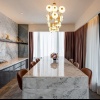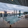 Королевский сьют на 50 этаже: 2 спальни с одной двуспальной и двумя двуспальными кроватями, 2 ванные комнаты с ванной и душевой кабиной, гардеробная, отдельная гостиная открытой планировки с кухней и столовой (обеденный стол на 6 персон), балкон с просторным частным бассейном (без подогрева), панорамный вид на город; привилегии для проживающих*, план номера;