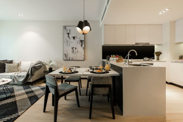 Спальня с двуспальной кроватью king-size, гостиная комната с диваном, обеденным столом на 4-х человек и полностью оборудованной кухней (индукционная плита, холодильник, микроволновая печь, тостер), ванная комната с ванной и душем, кабинет, возможно сделать смежным с номером Studio Executive, см.план номера;