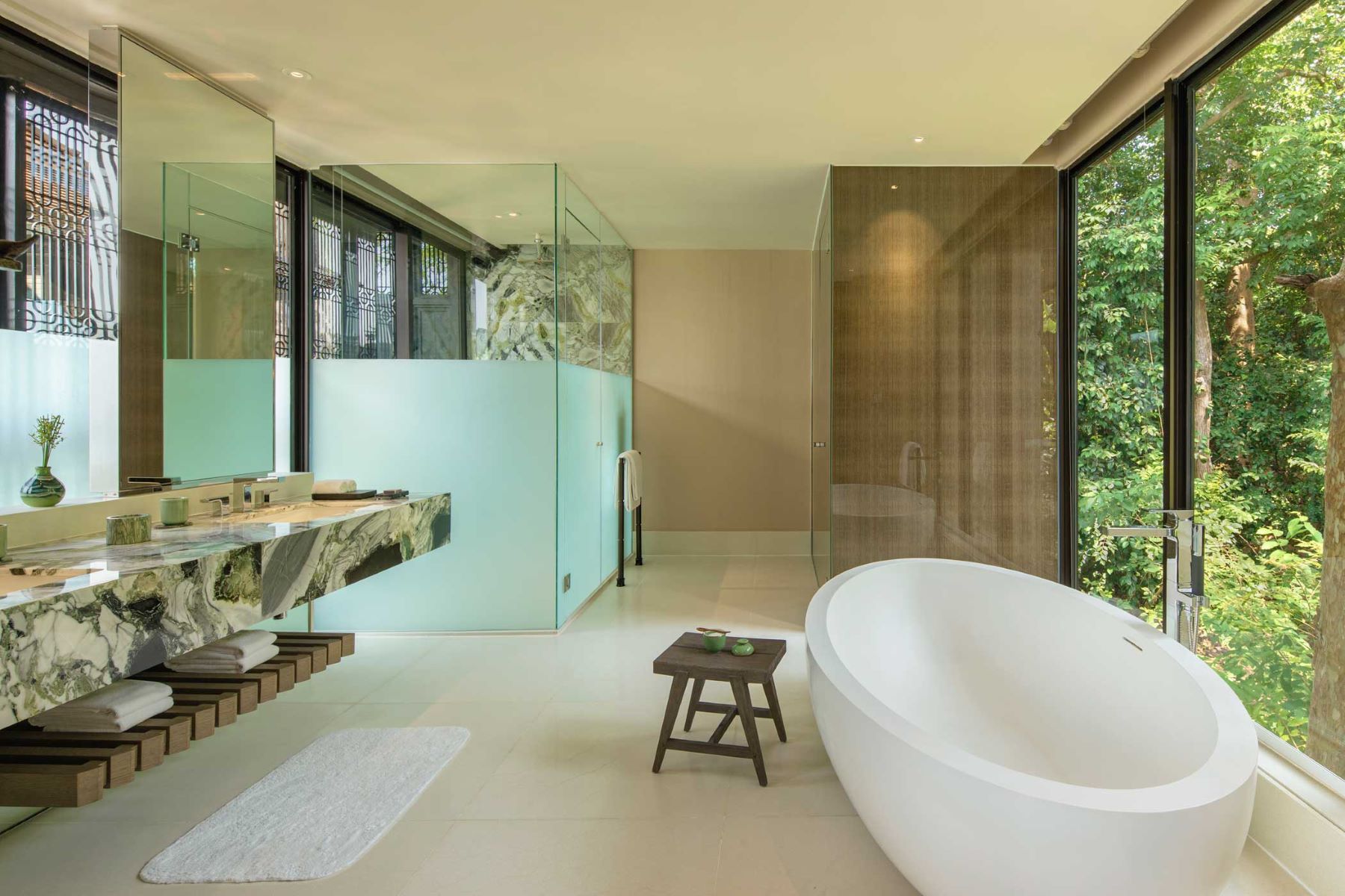 К размещению предлагаются просторные стильные номера и сьюты в трёхэтажных коттеджах с балконами и террасами, а также приватные виллы с собственными бассейнами.