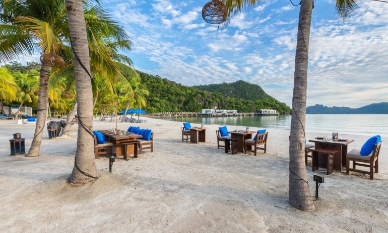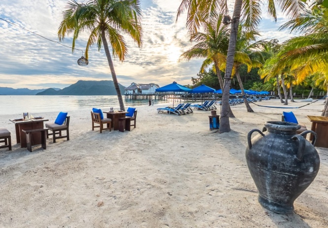 Королевская вилла с 4-мя спальнями на сваях над водой (доступ по пирсу): 3 спальни с двуспальной кроватью, одна спальня с 2-мя односпальными кроватями, 4 собственные ванные комнаты с ванной и душевой кабиной, отдельная гостиная, дополнительная комната отдыха, отдельная столовая с обеденным столом на 12 персон, рояль, полностью оборудованная кухня с кухонными принадлежностями, просторная меблированная терраса-патио, частный бассейн, вид на море и на закат.