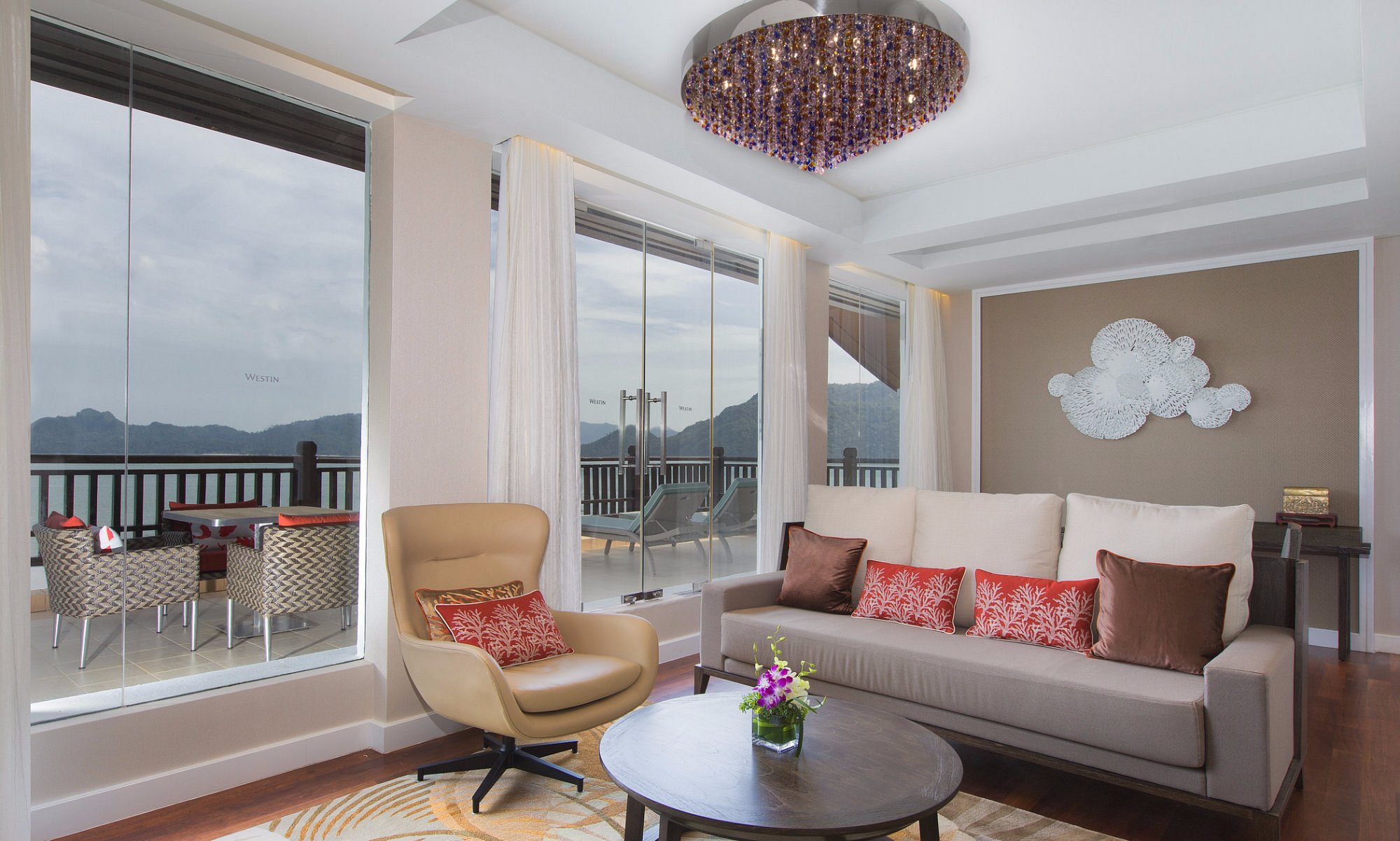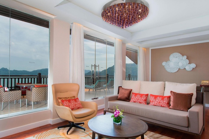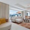 Сьют c 1-й двуспальной кроватью, раздвижные стеклянные двери в ванную комнату с ванной и душевой кабиной, отдельная гостиная с обеденной зоной, большой меблированный балкон, фронтальный вид на море;