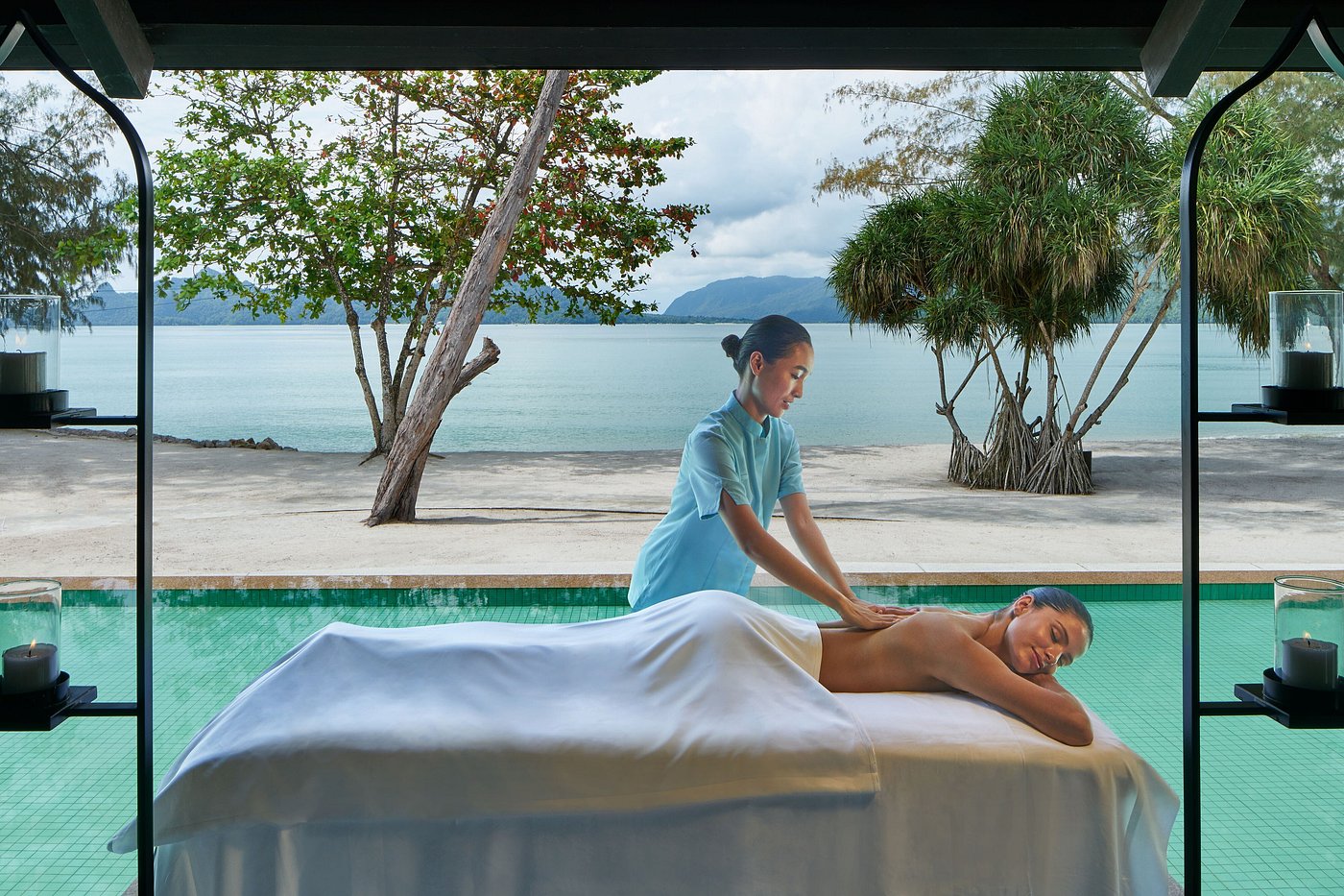 Двухэтажная вилла с 5-ю спальнями: три спальни - с двуспальной кроватью, две - с двумя односпальными кроватями, 5 собственных ванных комнат с ванной и душем, 2 гостиные, отдельная столовая с обеденным столом на 10 персон, мини-кухня (СВЧ-печь, кофеварка, чайник), зона для массажа, меблированная терраса (зонты, шезлонги), беседка, вид на океан и на пирс.