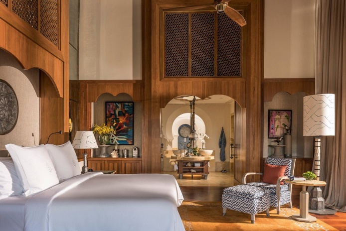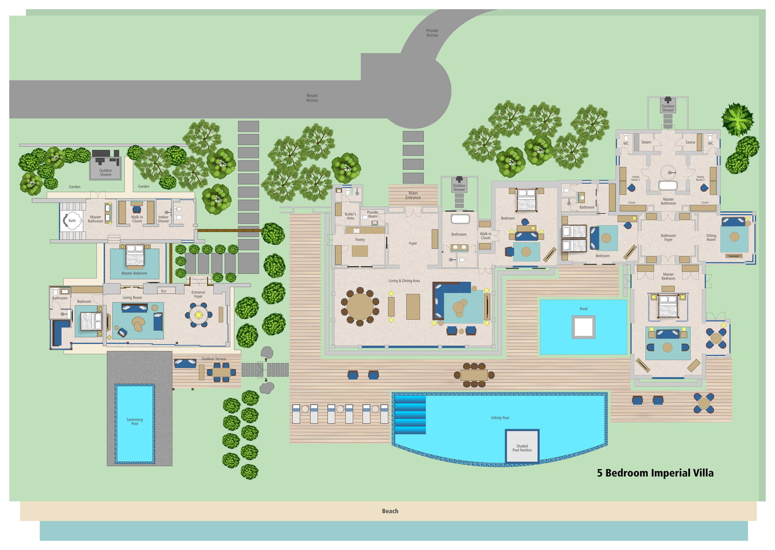 Королевская вилла с 5-ю спальнями представляет собой в плане объединенные соседние виллы Imperial Theee Bedroom Beach Villa With Pool и Premier Two-Bedroom Beach Villa with Pool: 5 спален, в трех – двуспальные кровати, в двух – 2 односпальные кровати, 5 ванных комнат: 3 из них - с душем, ванной и тропическим душем на открытом воздухе, 2 ванных комнаты – с душем; на вилле – сауна, хамам, гардеробные, 2 гостиные с обеденными зонами, кухня, подсобные помещения, помещение для консьержа, 2 меблированных террасы с обеденными зонами, беседками, 2 бассейна, сад, пляжный гамак, выход на пляж, частная подъездная дорожка, вид на море; привилегии для гостей*, план номера.