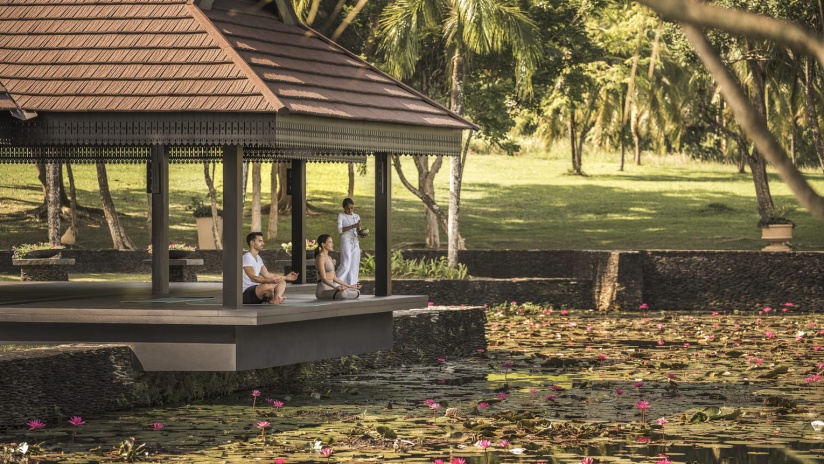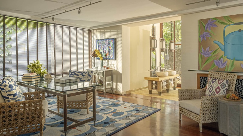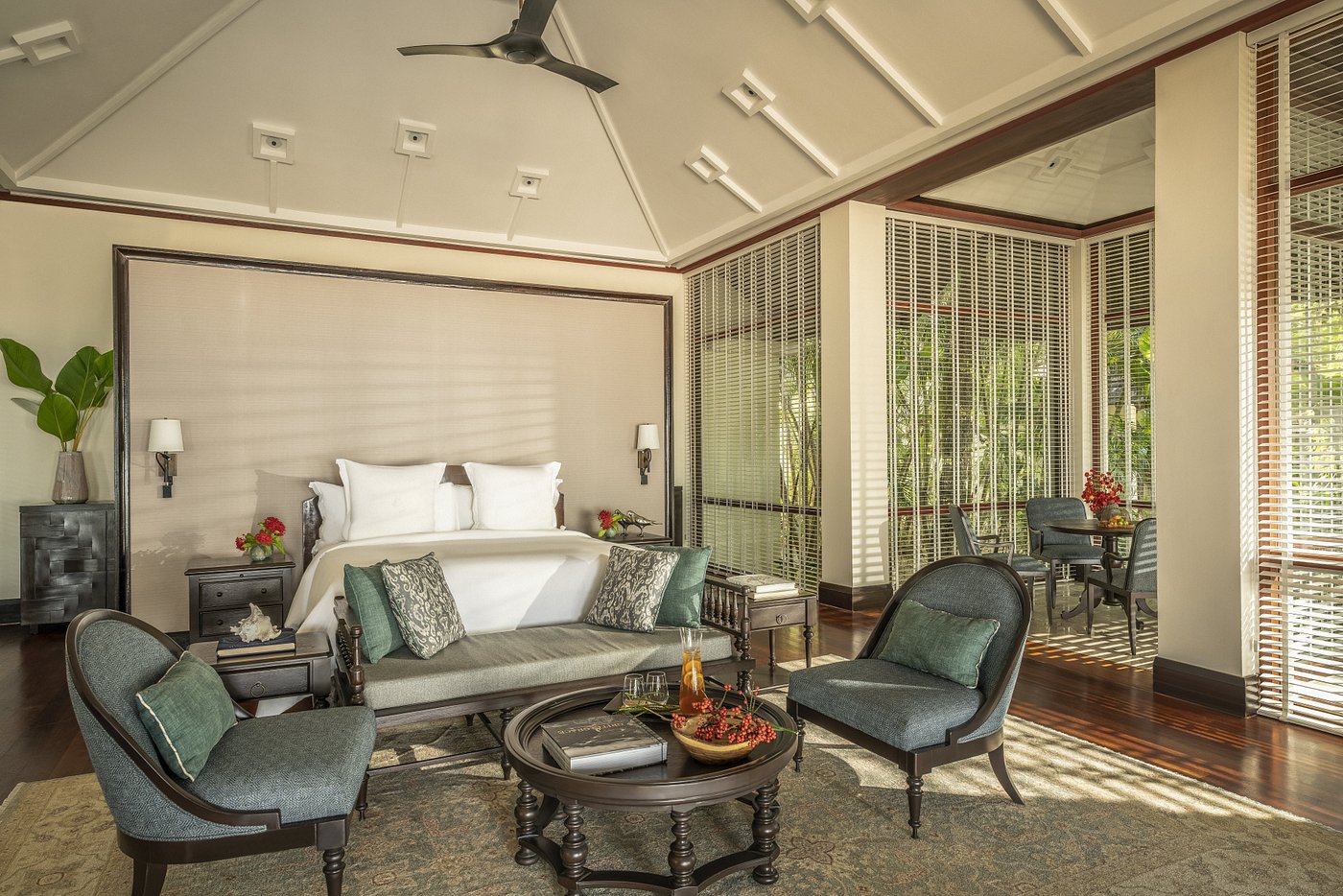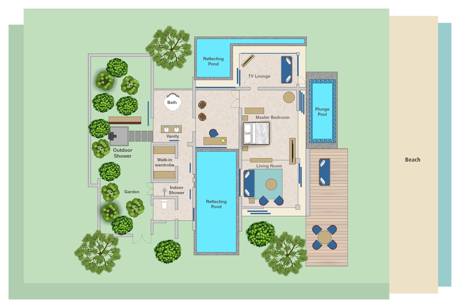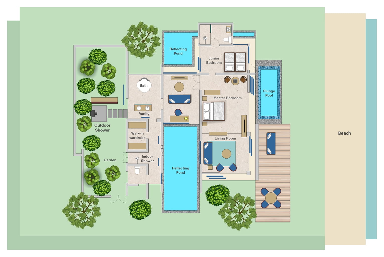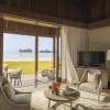 Пляжная вилла: спальня с двуспальной кроватью, ванная комната с ванной, душевой кабиной, гардеробной и тропическим душем на открытом воздухе, гостиная зона отделена стеллажной перегородкой, есть отдельный TV–лаунж, отдельный кабинет, меблированная терраса с обеденной зоной на 4 персоны, шезлонги, пляжный гамак, частный бассейн (14 м²), сад, выход на пляж, вид на пруды, море и пляж; привилегии для гостей*, план номера;