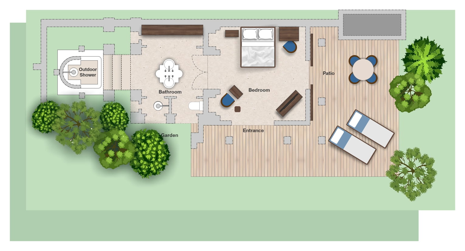 Номер на 1 этаже двухэтажного корпуса: 1 двуспальная или 2 односпальные кровати, ванная комната с душевой кабиной, ванна и душ на открытом воздухе, открытая меблированная терраса-патио и выход на благоустроенный газон, вид на сады, план номера;