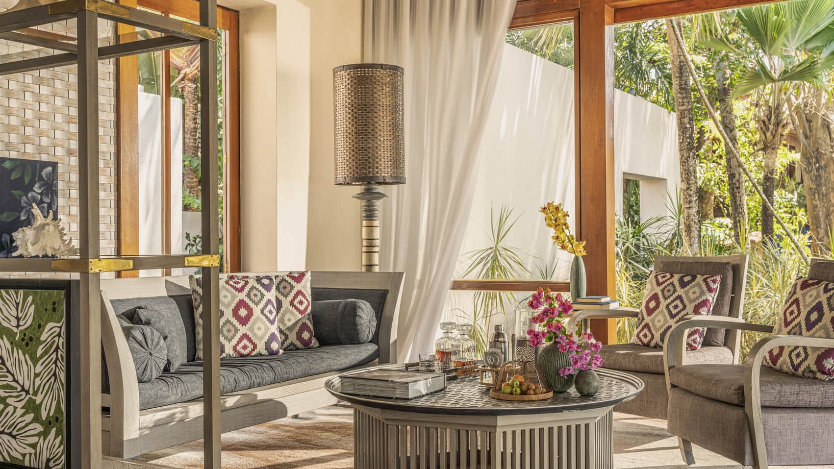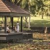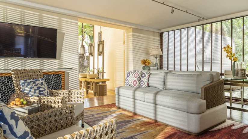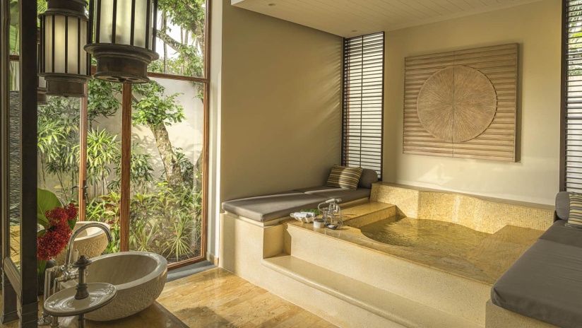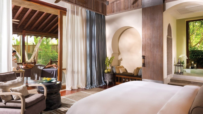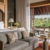 Вилла c 3-мя спальнями в южной части курорта: 2 спальни с двуспальными кроватями, каждая с собственной ванной комнатой с ванной и душевой кабиной, ванной-джакузи и душем на открытом воздухе; 1 спальня с двумя односпальными кроватями и собственной ванной комнатой с душевой кабиной, просторная гостиная с зоной отдыха и обеденной зоной на 8 персон, гардеробная/ кладовая, выход на меблированную террасу-патио с обеденным столом и зонами отдыха с кушетками и шезлонгами, частный бассейн (22 м²), сад, вид на сад; привилегии для гостей*, план номера;