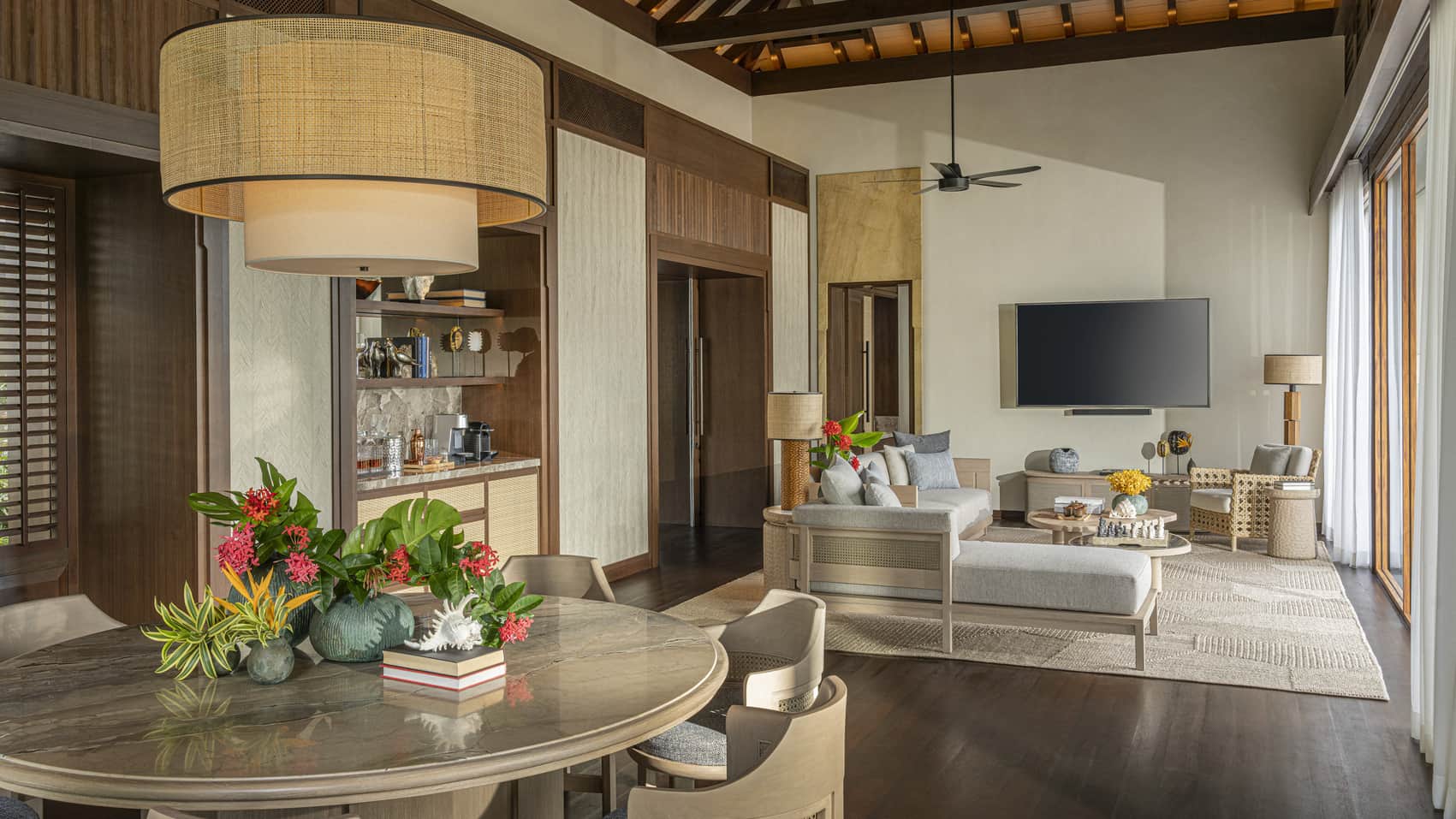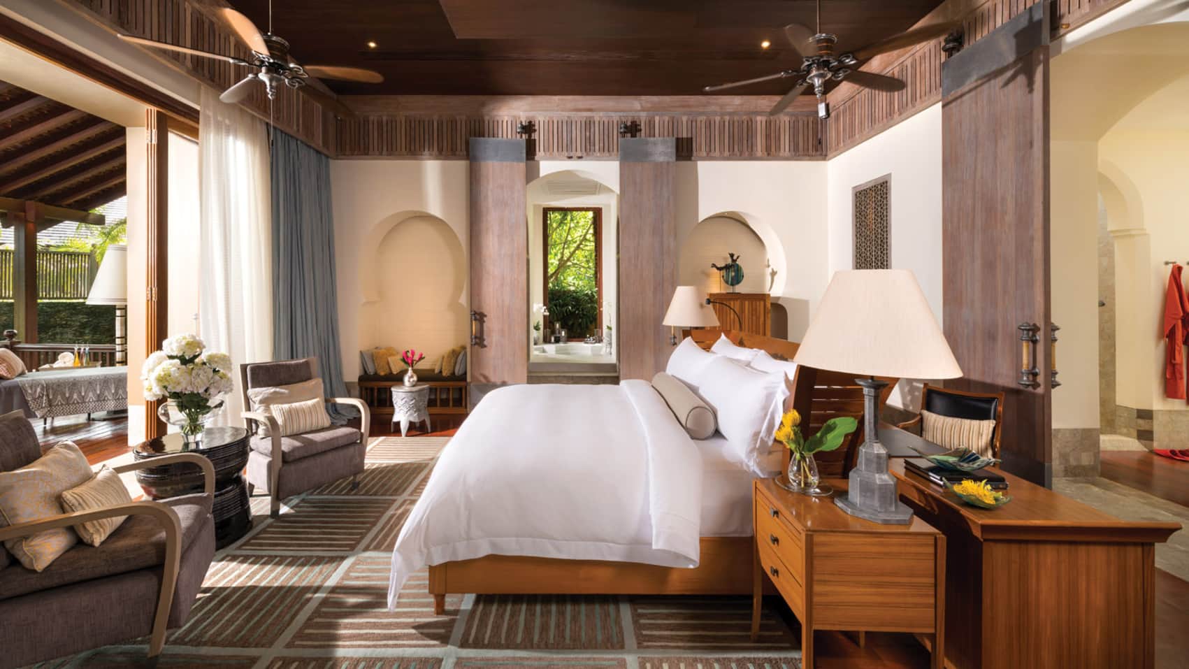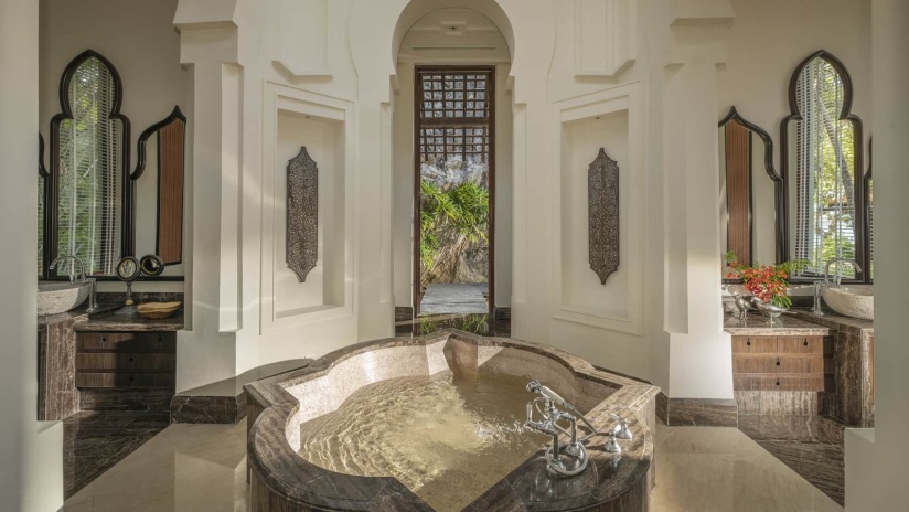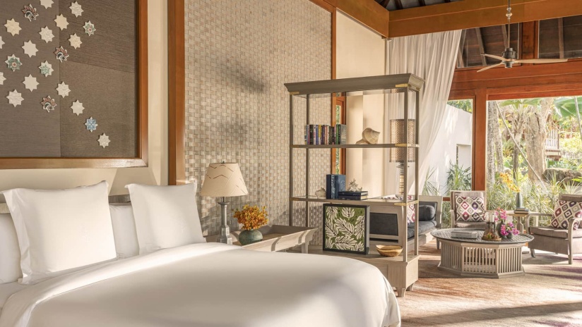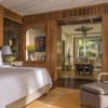 Королевская вилла из двух раздельных павильонов: в одном – спальня с двуспальной кроватью, кушеткой, обеденным столом и просторной ванной комнатой с ванной, душевой кабиной, гардеробной и тропический душ на открытом воздухе, выход из спальни на собственную меблированную террасу с обеденной зоной, шезлонгами и беседкой: в другом павильоне – гостиная с зоной отдыха, обеденным столом на 6 персон, барная стойка, подсобные помещения, гостевой туалет, выход на вторую меблированную террасу с обеденной зоной на 6 персон, кушеткой, шезлонгами, беседкой и бассейном-инфинити, сад, пляжный гамак, выход на пляж; вид на море, на скалы и лес, привилегии для гостей*, план номера;