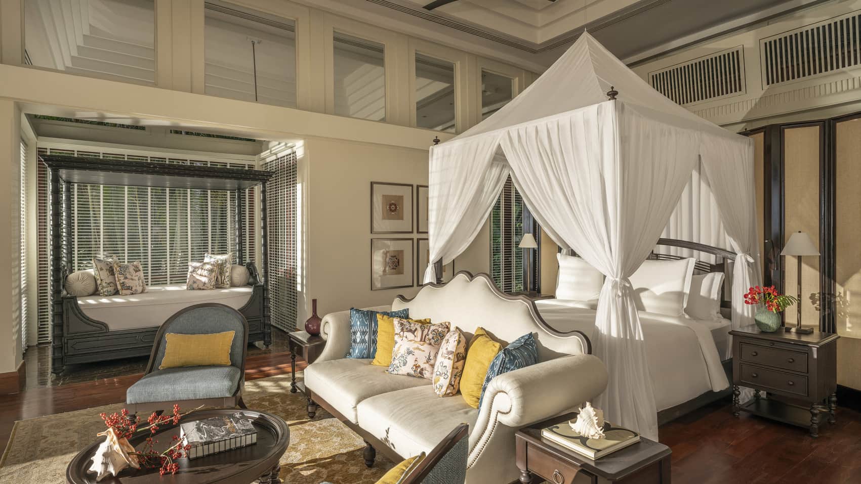 Номер на верхнем этаже: 1 двуспальная кровать, кушетка, гостевой уголок, ванная комната с душем, ванна и душ на открытом воздухе, меблированный балкон с обеденной зоной и кушеткой, вид на ландшафтный сад, план номера;