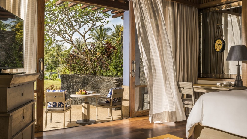 Номер на 1 этаже двухэтажного корпуса: 1 двуспальная кровать, гостевой уголок, ванная комната с душем, ванна и душ на открытом воздухе, меблированная терраса-патио с обеденной зоной, выход к пляжу, частичный вид на море, план номера;