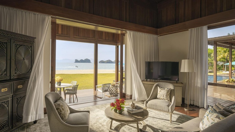 Пляжная семейная вилла с 1 двуспальной и 2-мя односпальными кроватями, ванная комната с ванной, душевой кабиной, гардеробной и тропический душ на открытом воздухе, гостиная зона отделена стеллажной перегородкой, меблированная терраса с обеденной зоной на 4 персоны, шезлонги, частный бассейн (12 м²), сад, искусственные пруды, пляжный гамак, выход на пляж, вид на море; гостям предоставляется трансфер из аэропорта и обратно и 1 бесплатный напиток из мини-бара по прибытии; план номера;