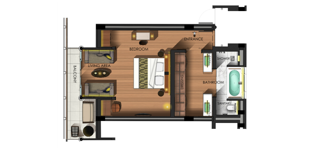 Номер в главном здании со спальней и гостиной зоной, 2-3 этаж: двуспальная кровать king-size или 2 односпальные кровати; письменный стол, туалетный столик, 2 дивана, отдельная ванная комната с душевой кабиной, ванной, двойной раковиной и гардеробной зоной, меблированный балкон, вид на тропический лес, план номера;