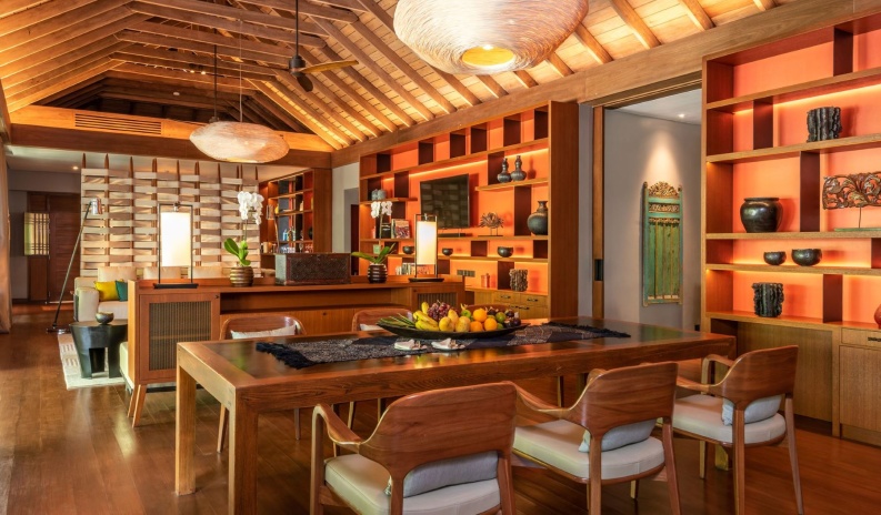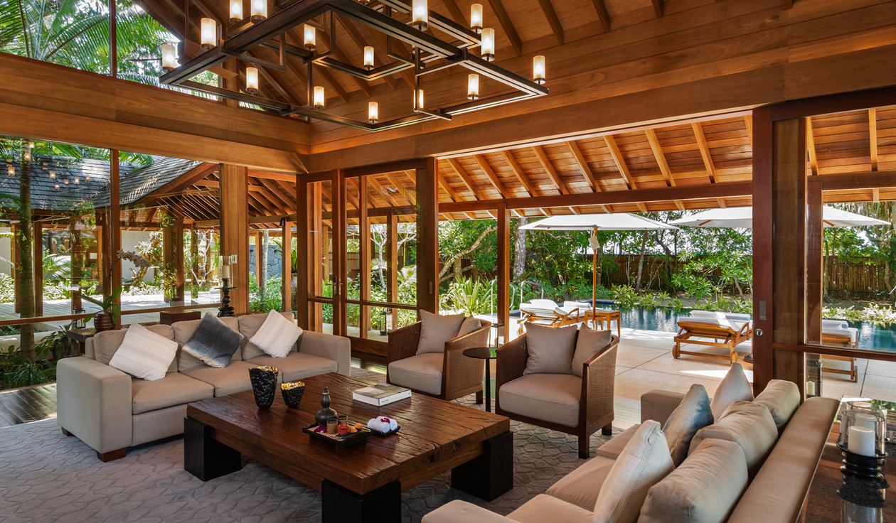 Вилла с 2-мя спальнями с на берегу: с двуспальной кроватью и 2-мя односпальными кроватями, 2 ваннные комнаты (обе с ванной и душем), гардеробные, отдельная гостиная-столовая с высокими деревянными потолками, окнами от пола до потолка, диваном, обеденным столом, подсобное помещение/ кухня для дворецкого, меблированная терраса, открытая обеденная зона на 8 персон, частный бассейн (10 м²), сад, выход к пляжу, привилегии для проживающих в номере*, план виллы.