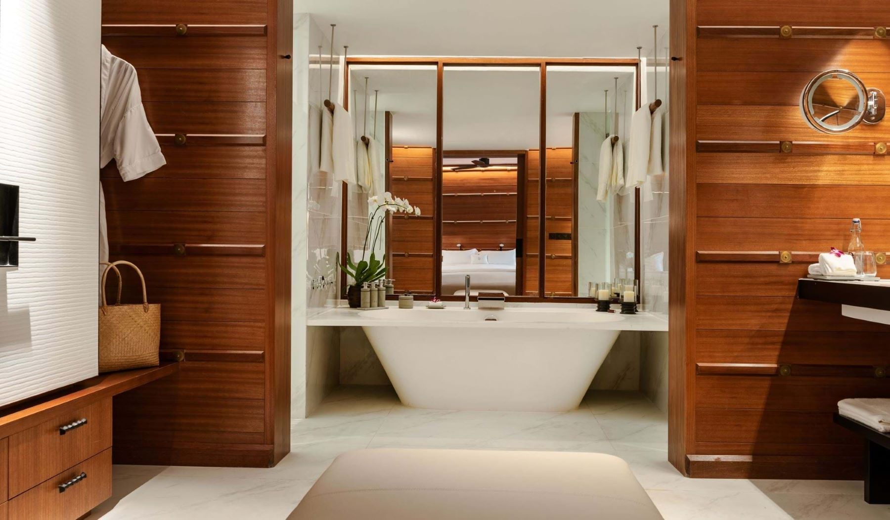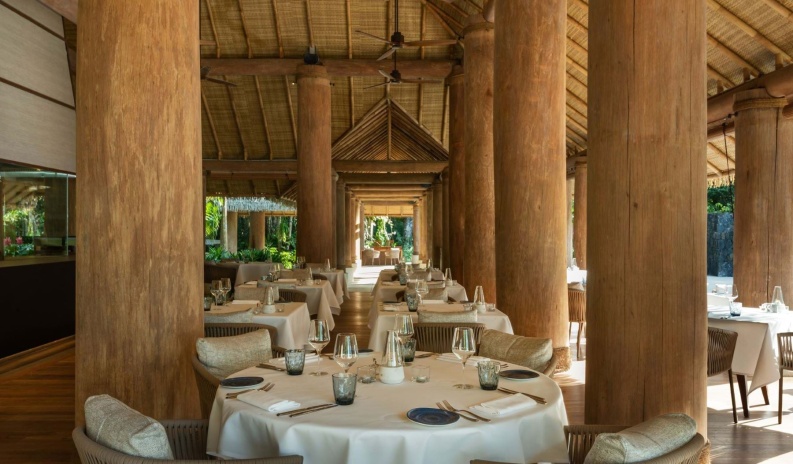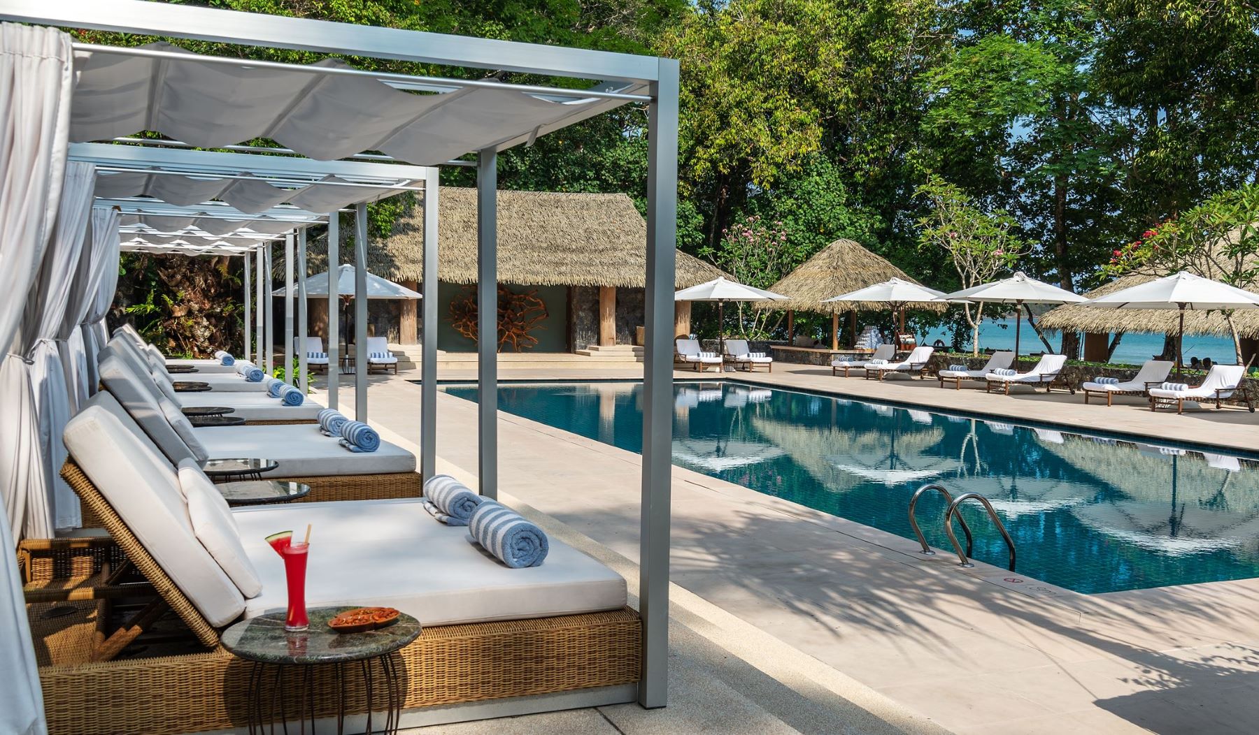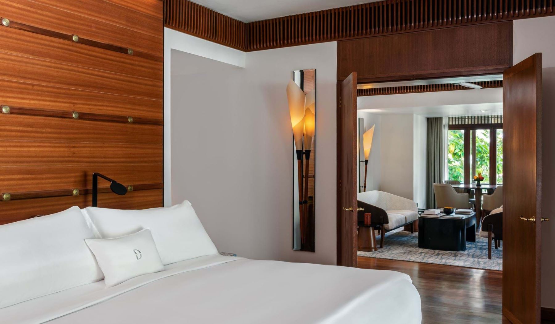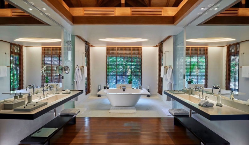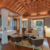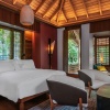 Вилла с 1 спальней с на берегу: спальня с двуспальной кроватью и кушеткой, ванная комната с дизайнерской ванной, душевой кабиной, двойной раковиной, гардеробной, отдельная гостиная с высокими деревянными потолками, окнами от пола до потолка, диваном и обеденным столом на 4 персоны, подсобное помещение/ кухня для дворецкого, меблированная терраса с открытым персональным бассейном (10 м²), сад, выход к пляжу, привилегии для проживающих в номере*, план виллы;