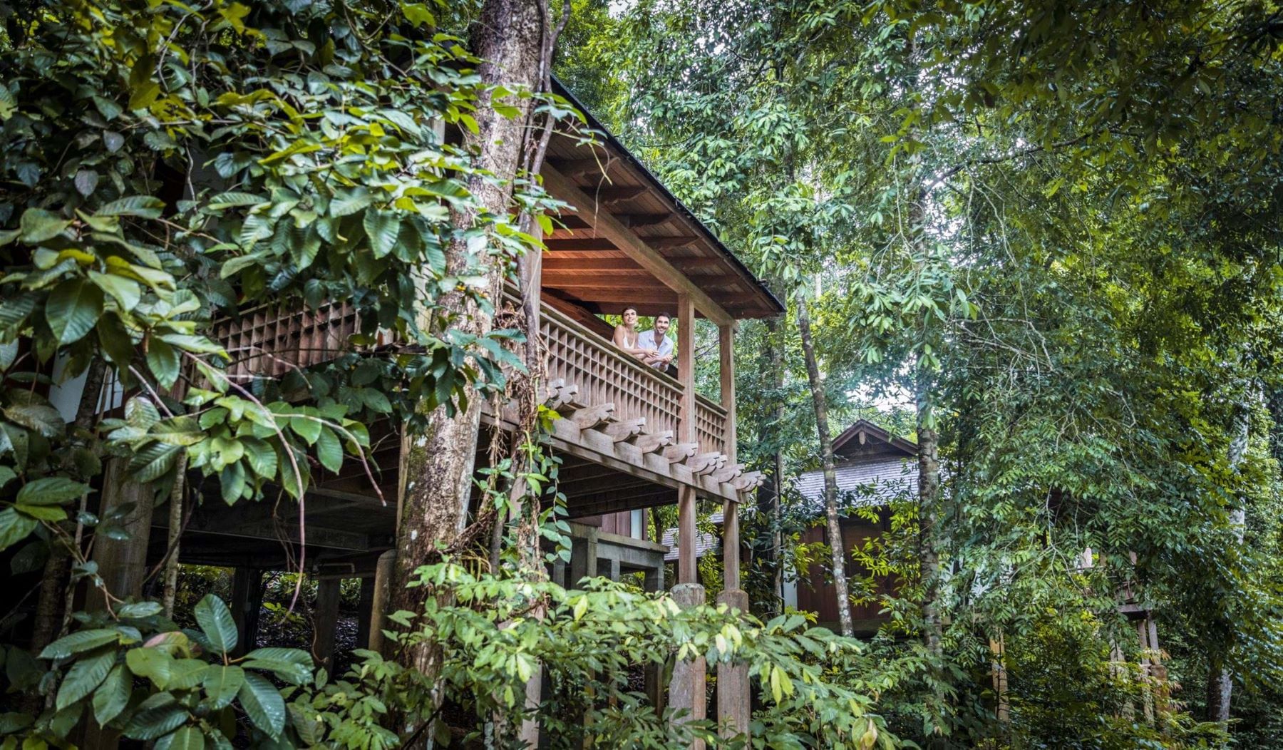 Уединенные виллы** на сваях в тропическом лесу, открытая планировка: двуспальная кровать king-size или 2 односпальные кровати, письменный стол, туалетный столик, гостиная зона с диваном, просторная ванная комната с душевой кабиной, ванной, двойной раковиной и гардеробной зоной, пополняемый мини-бар (за исключением снэков и алкогольных напитков), меблированный балкон, вид на тропический лес; план виллы;
