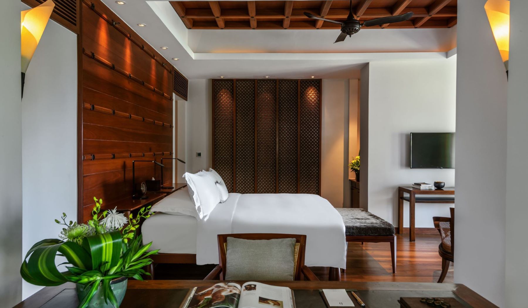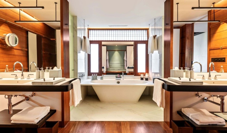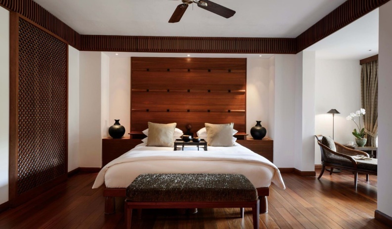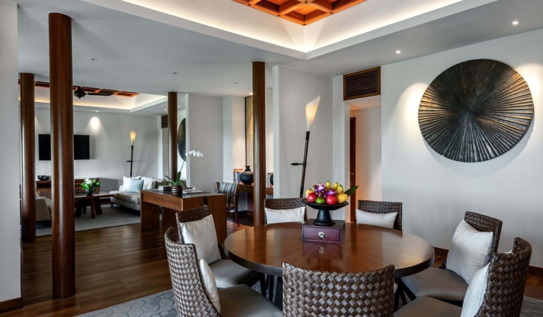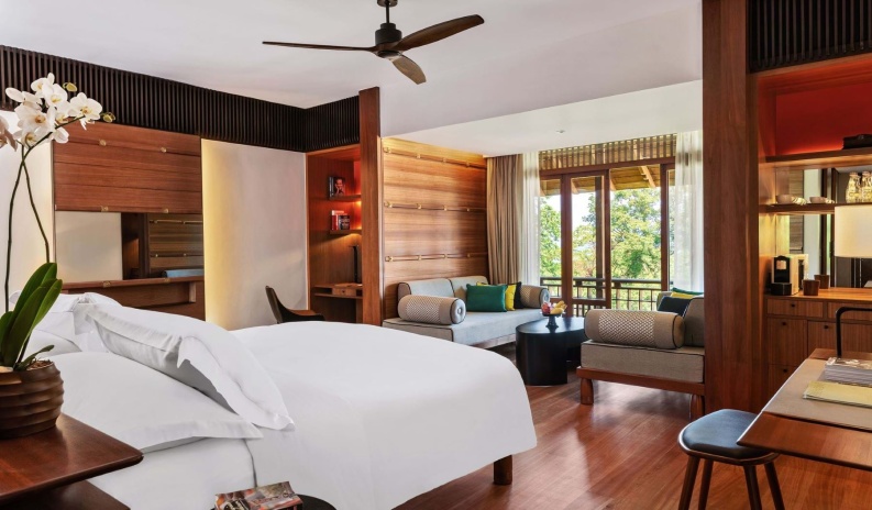 Самый просторный сьют, в главном здании на верхнем этаже: 2 спальни с двуспальной кроватью и двумя односпальными кроватями с собственными ванными комнатами, в каждой ванна и душевая кабина, просторная гостиная с диваном (спальное место для 1-го взрослого/ 2-х детей, рабочей зоной со столом представительского класса, обеденной зоной на 6 персон, дополнительная гостевая ванная комната с душем, гардеробная, подсобное помещение/ кухня для дворецкого, большой меблированный балкон с панорамным видом на тропический лес и Андаманское море, привилегии для проживающих в номере*, план номера;