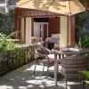 Номер в главном здании со спальней и гостиной зоной,1 этаж: двуспальная кровать king-size или 2 односпальные кровати; письменный стол, туалетный столик, 2 дивана, отдельная ванная комната с душевой кабиной, ванной, двойной раковиной и гардеробной зоной, терраса-патио с обеденным столом на 4 персоны и зонтом от солнца, вид на сад, план номера;