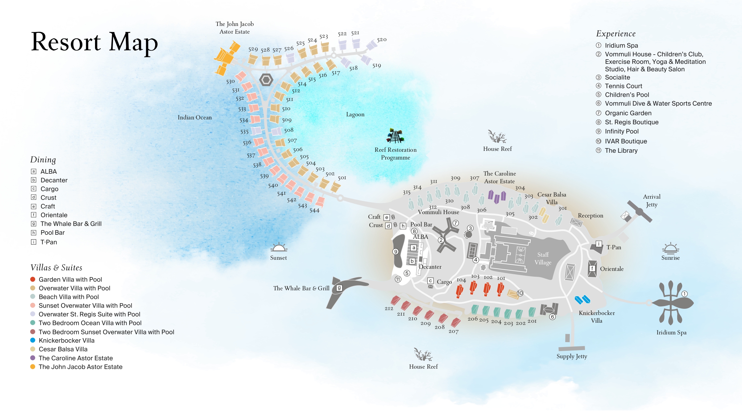 Каждая вилла вдохновлена сокровищами острова и его окрестностей — например, надводные виллы повторяют изящные формы мант. Виллы разделены на четыре зоны — Lagoon, Beach, Jungle и Coastal, а интерьер каждой отражает своё расположение. John Jacob Astor Estate — самая большая трёхспальная надводная вилла на Мальдивах, площадь которой составляет 1 726 м².