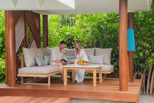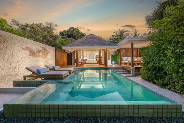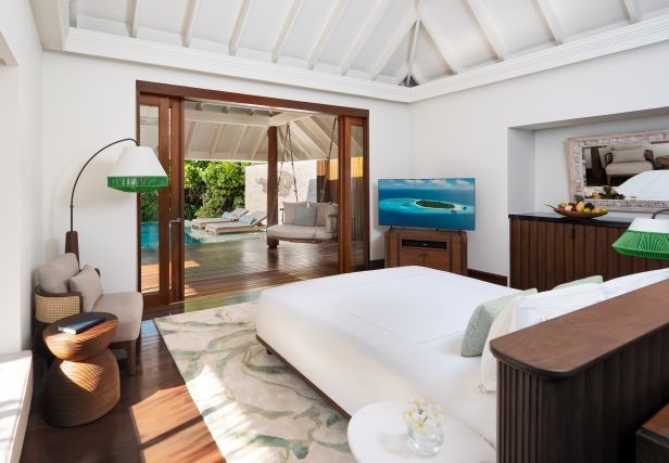 2 спальни: двуспальная кровать king-size и 2 односпальные кровати, отдельная гостиная комната с диваном, кухней и обеденной зоной, 2 ванные комнаты с ванной на открытом воздухе, гардеробная зона,терраса с обеденной зоной, лежаками, качелями, частный бассейн, джакузи, комната с тренажёрами, комната для спа-процедур, общая площадь участка 1330 м², доступ к пляжу, план номера, индивидуальный трансфер в зал ожидания аэропорта, сеанс наблюдения за звездами в обсерватории, частный шеф-повар и винный гуру для персонализированных ужинов;