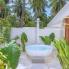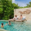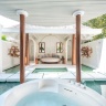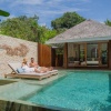 Расположены на пляже, спальня с двуспальной кроватью king-size, спальная зона с 2 отдельными кроватями (нет межкомнатной двери между спальными зонами), ванная комната с душем, душ и ванна на открытом воздухе, терраса с открытым персональным бассейном, обеденной зоной, качелями и лежаками, план номера;