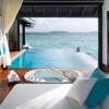 Расположены на сваях над водой, двуспальная кровать king-size, ванная комната с гидромассажной ванной со стеклянным дном и душем, терраса с частным бассейном, обеденной зоной, гамаками и лежаками и лестницей, ведущей в океан, план номера;