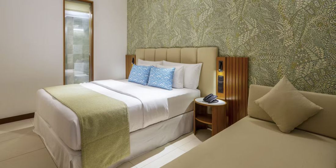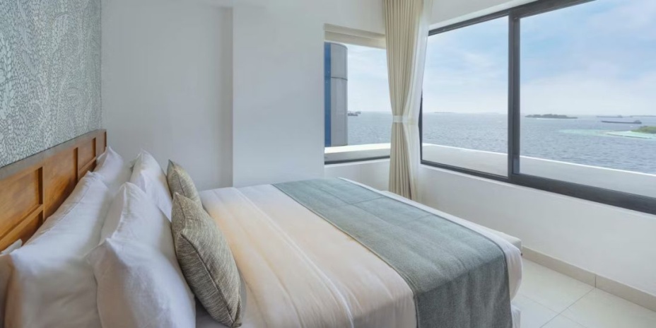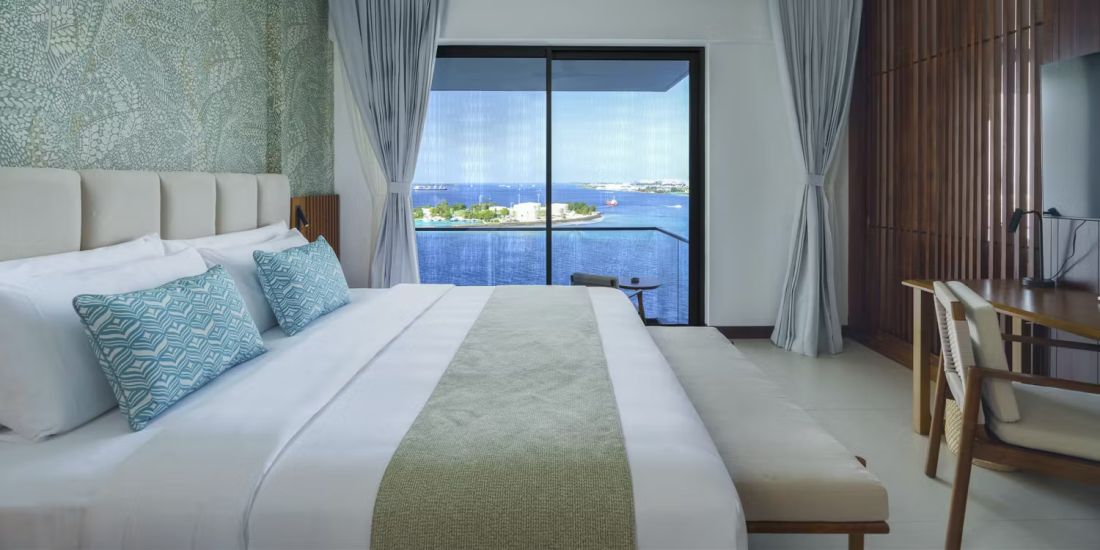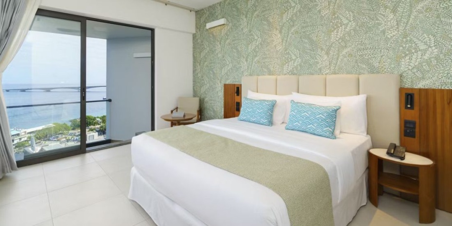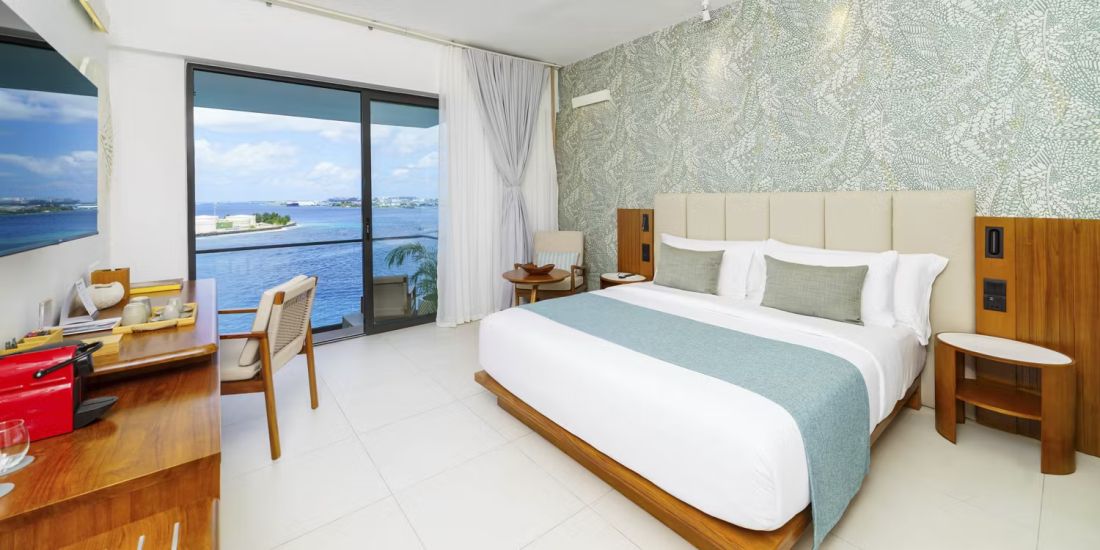 Двуспальная кровать queen-size (180 х 200 см), ванная комната, меблированный балкон, вид на международный аэропорт Мале, мост Синамалé и частичный вид на океан, есть смежные номера (по запросу);