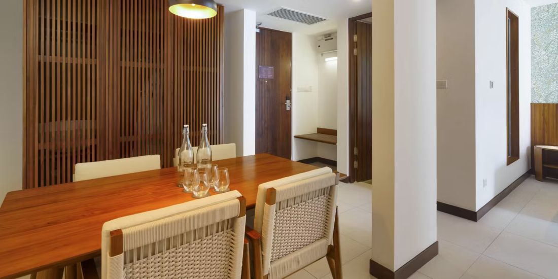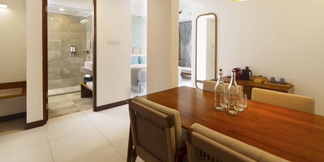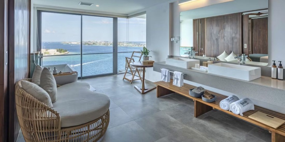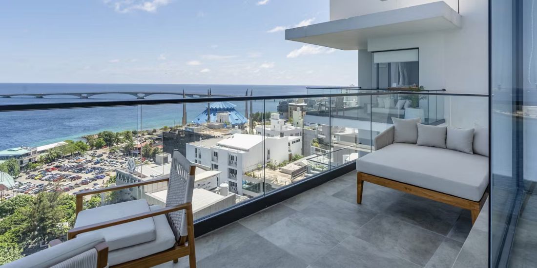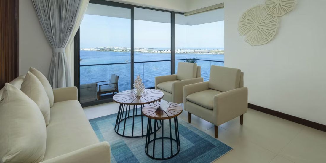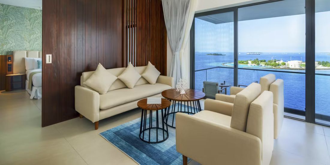 Спальня с двуспальной кроватью king-size (200 х 200 см), гардеробная, гостиная комната с диваном и обеденным столом, ванная комната с ванной, 3 балкона, включая большой угловой балкон с видом на международный аэропорт Мале и мост Синамале; панорамный вид на северный атолл Мале и соседние острова;
