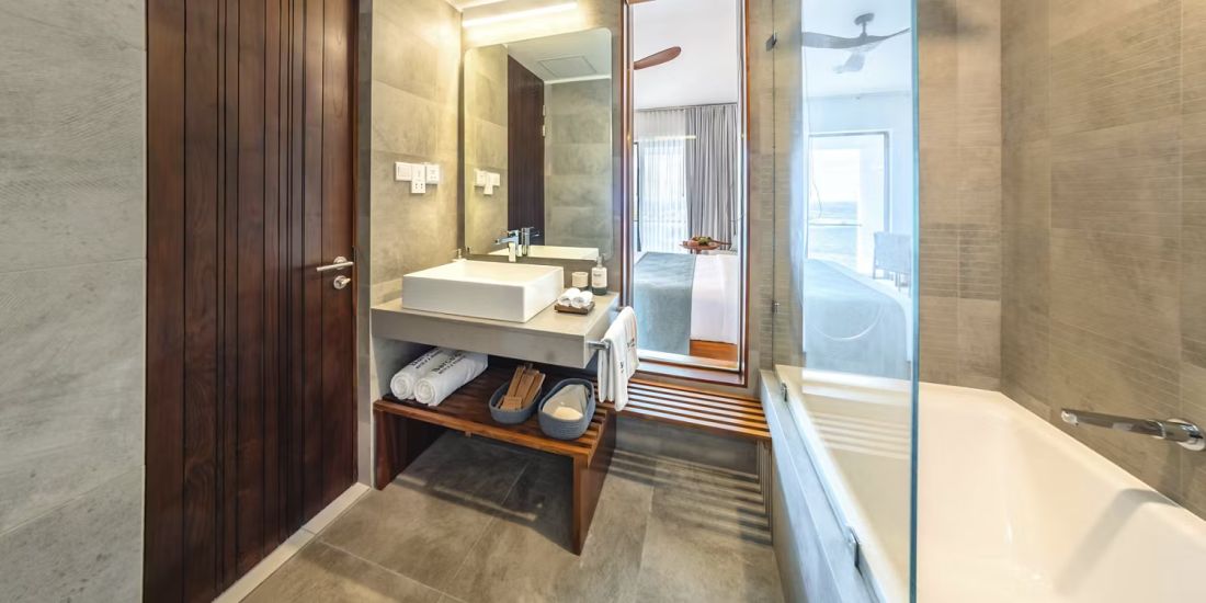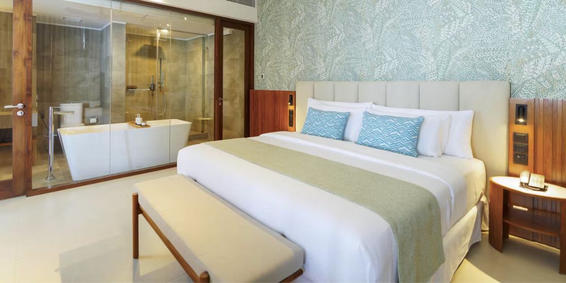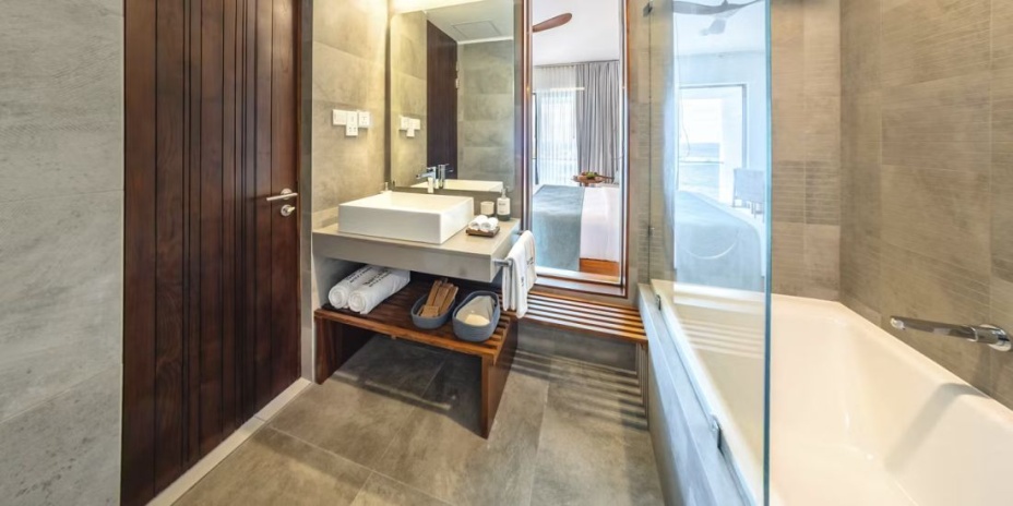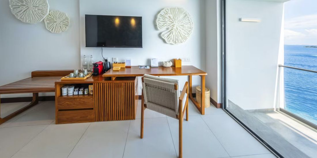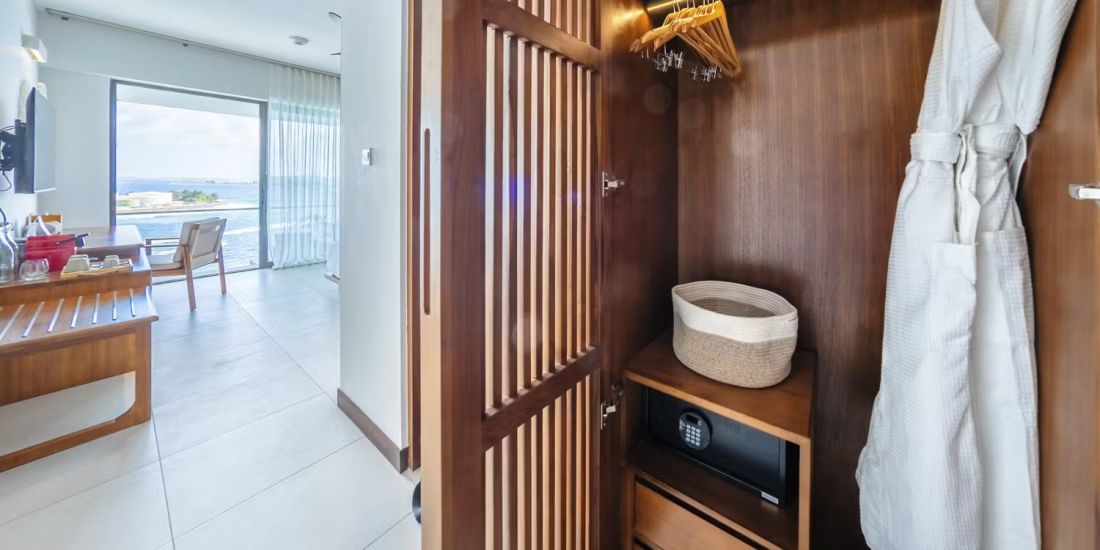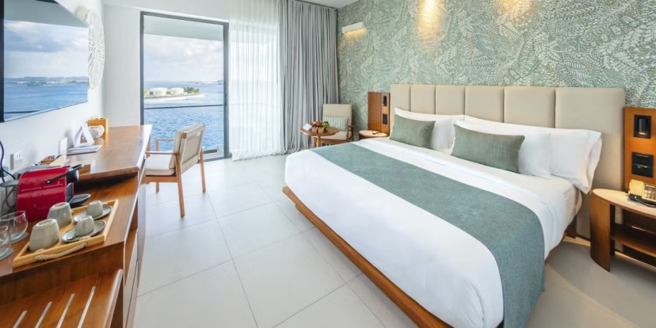 Двуспальная кровать queen-size (180 х 200 см), ванная комната, просторный балкон, обрамляющий две стороны номера, панорамные виды на северную часть аэропорта и соседние острова Северного атолла Мале, есть смежные номера (по запросу);