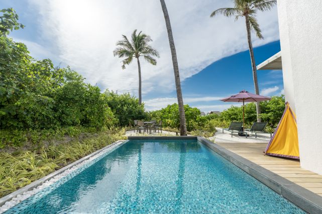 Двухуровневый номер (этажи соединены удобной для детей лестницей), 2 спальни: двуспальная кровать king-size, двухъярусная кровать, диван-софа, 2 ванные комнаты с душами, душ под открытым небом, терраса, персональный бассейн, прямой выход на пляж, вид на океан, велосипед бесплатно, см.план номера, виртуальный тур по номеру, новая категория 2025;