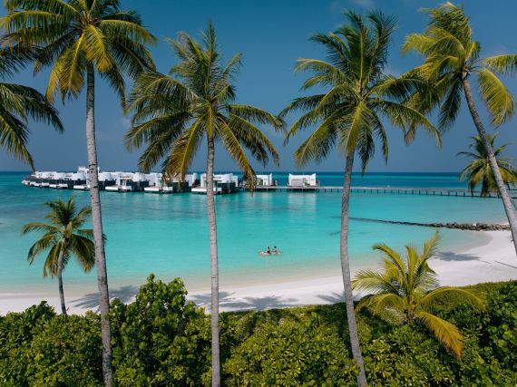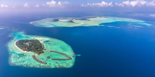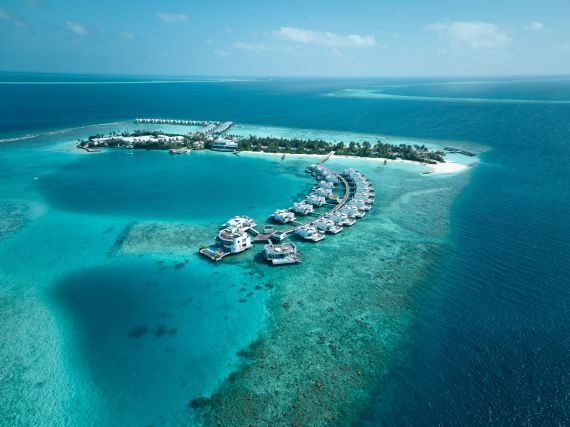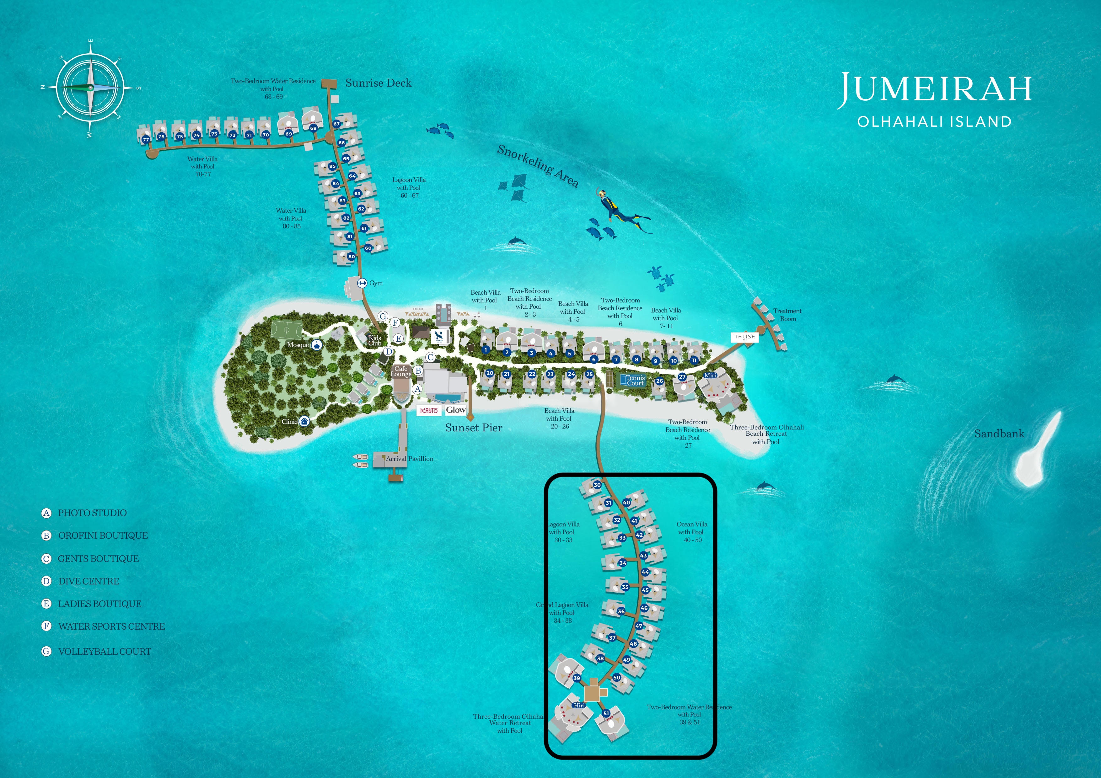 Расположены на сваях над водой по обе стороны острова, спальня с двуспальной кроватью king-size, отдельная гостиная комната с диваном, гардеробная, ванная комната с ванной, душем, внутренним двориком и душем под открытым небом, гостевой туалет, терраса с частным бассейном размером 7х3,5х1,2 м, душ на террасе, меблированная терраса на крыше, прямой спуск в воду, панорамный вид на океан, см.план номера, план террасы на крыше;