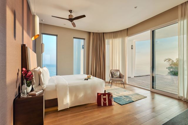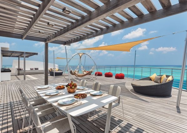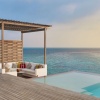 Расположены на сваях над водой, 2 спальни: двуспальная кровать king-size и 2 односпальные кровати, 2 ванные комнаты с ванной, 2 душа под открытым небом, гардеробная, отдельная гостиная комната с диваном, гостевой туалет, меблированная терраса с лежаками и персональным бассейном размера 14,3 х 4,2 х 1,2 м, меблированная терраса на крыше, вид на океан, прямой спуск в воду, см.план номера, план террасы на крыше;